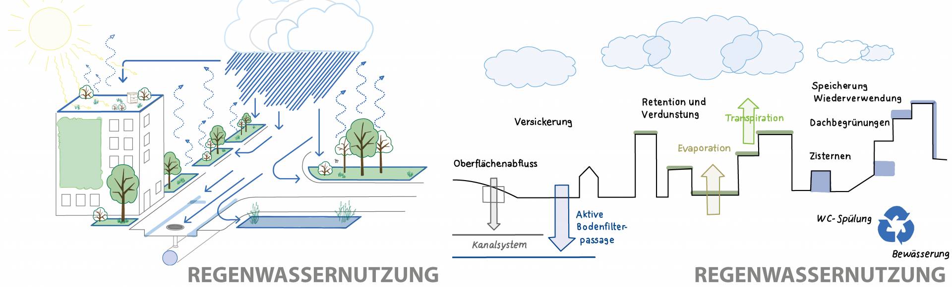 Bei der Planung der Altstadterweiterung wurde darauf geachtet möglichst wenig Flächen zu versiegeln. Dies dient dem Zweck, dass das Regenwasser direkt dem natürlichen Wasserkreislauf zugeführt werden kann. Ein weiterer Aspekt zur Entsiegelung ist die Begrünung der Dachflächen. Ebenfalls soll das Regenwasser zum einen zur Bewässerung der öffentlichen sowie privaten Grünflächen herangezogen werden als auch zur Nutzung als Toilettenspülwasser. Hierfür wird mittelts Zisternen eine Wasserspeicherung vorgenommen. Des Weiteren wurden in dem gesamten Gebiet Versickerungsmulden eingeplant.
