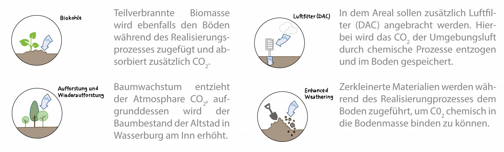 Die Reduktion von CO2-Emissionen ist ein Leitgedanke bei der Planung des neuen Areals in der Altstadt von Wasserburg. Erste Ansätze hierfür werden bereits in der Grünanlagenplanung des Quartieres und der Mobilitätsauslegung sichtbar. Demnach müssen die Treibhausgasemissionen reduziert werden. Zur Erreichung dieser Reduzierung werden sogenannte negative Emissionen herangezogen. Hierbei handelt es sich um Funktionsweisen, welche der Atomsphäre CO2 entziehen sollen. Hierfür wird auf mehrere einfachen Lösungen zurückgegriffen.