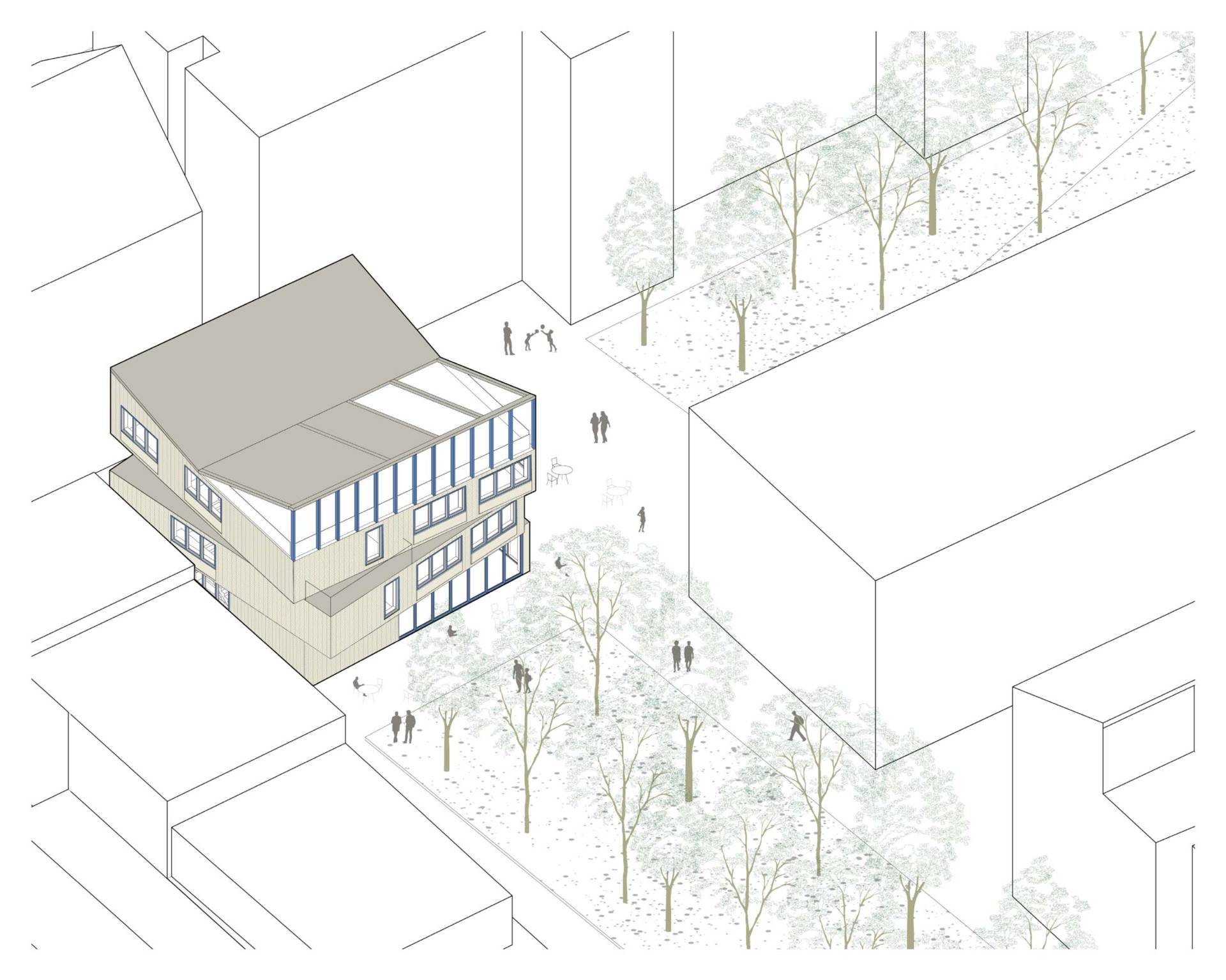 Mit ihrem Entwurf des „Stapeltreff“ haben die Studierenden Thomas Bölderl, Mina Dewald, Julian Reich und Lion Schellmoser die Jury überzeugt und den 3. Platz belegt. Der Entwurf liegt im Übergangsbereich zwischen dem neuen Klett-Park und dem ruhigen Grünbereich im Westen und bildet ein gelungenes Bindeglied, das sich harmonisch in beide Richtungen öffnet. Die Gestaltung, inspiriert von der Form eines Bücherstapels, lässt die Geschosse ineinander verschlingen, während das Dach an ein aufgeschlagenes Buch erinnert. Diese architektonische Lösung integriert sich elegant in die Umgebung und bereichert das städtebauliche Gesamtbild.