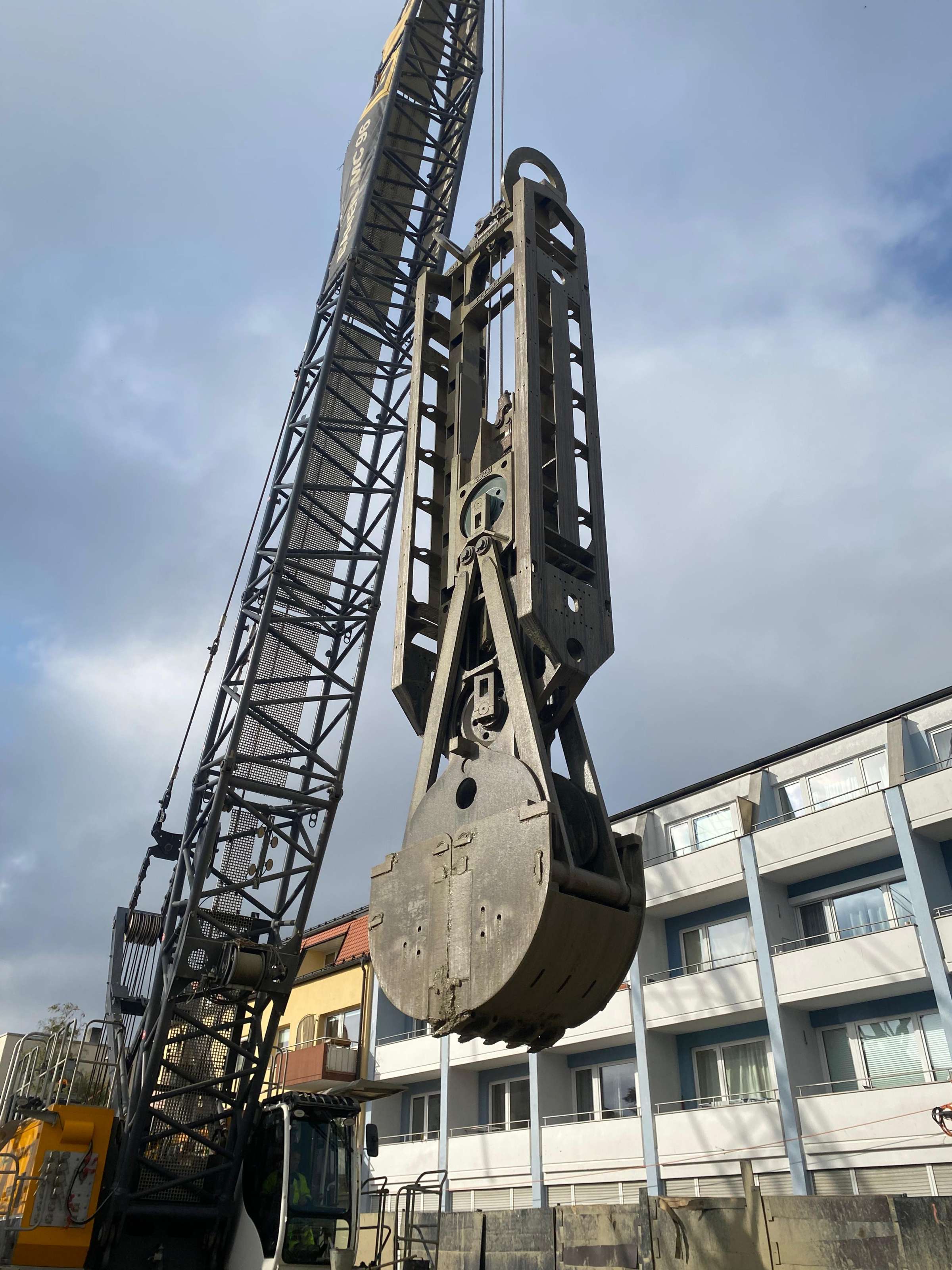 - Um den Baugrube für den Tunnel zu sichern, wird eine 34 Meter tiefe und 1,20 Meter breite Schlitzwand hergestellt. Dazu werden nacheinander 7,40 Meter lange Lamellen mit einem Greifer ausgehoben. Damit die so entstandenen Schlitze standsicher bleiben, werden sie mit einer Bentonitsuspension gestützt. Nach dem Erreichen der Endtiefe werden Bewehrungskörbe eingestellt und der Schlitz ausbetoniert. Im Zuge des Betonierens muss die Stützflüssigkeit zur Regenerationsanlage abgepumpt werden.