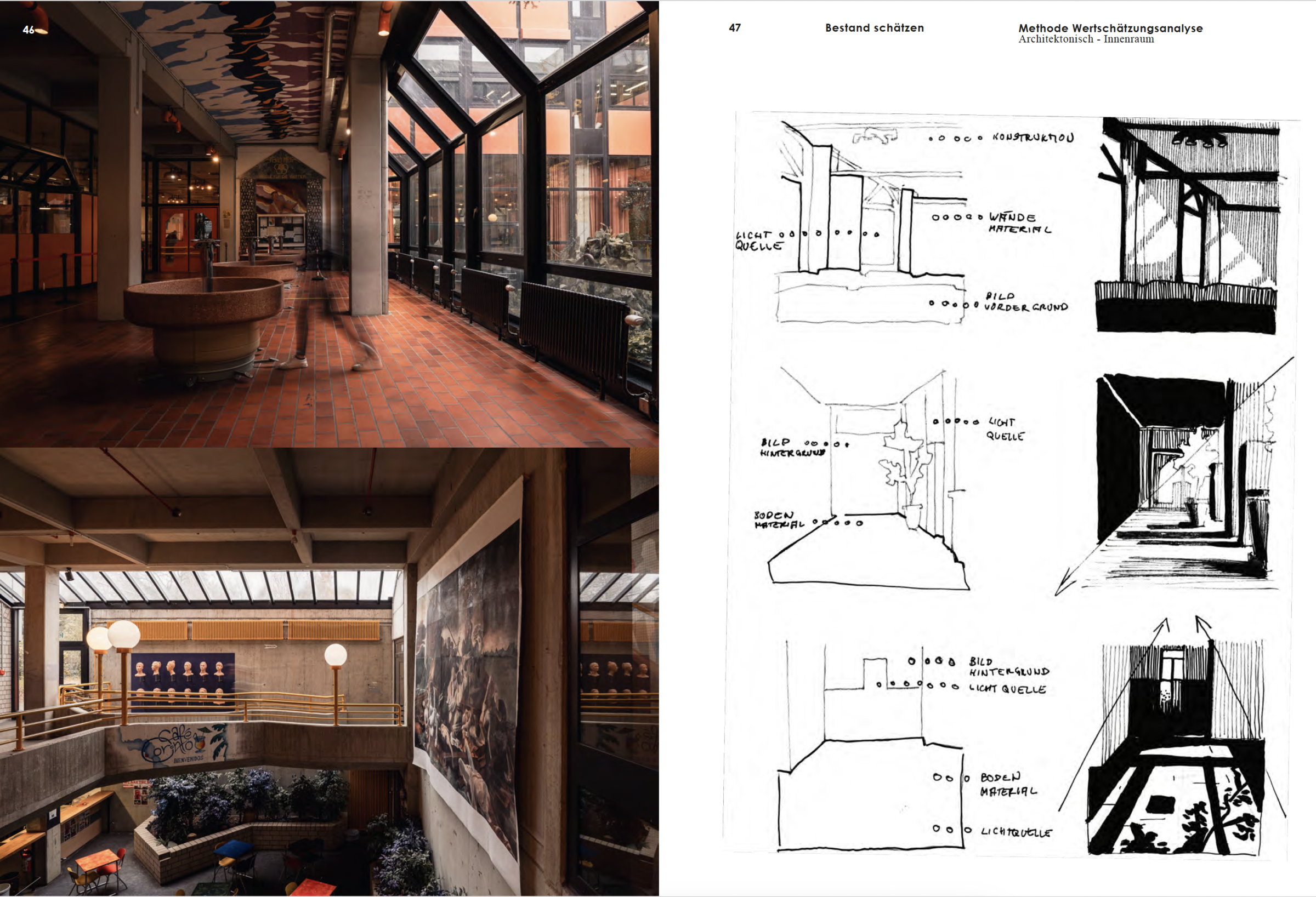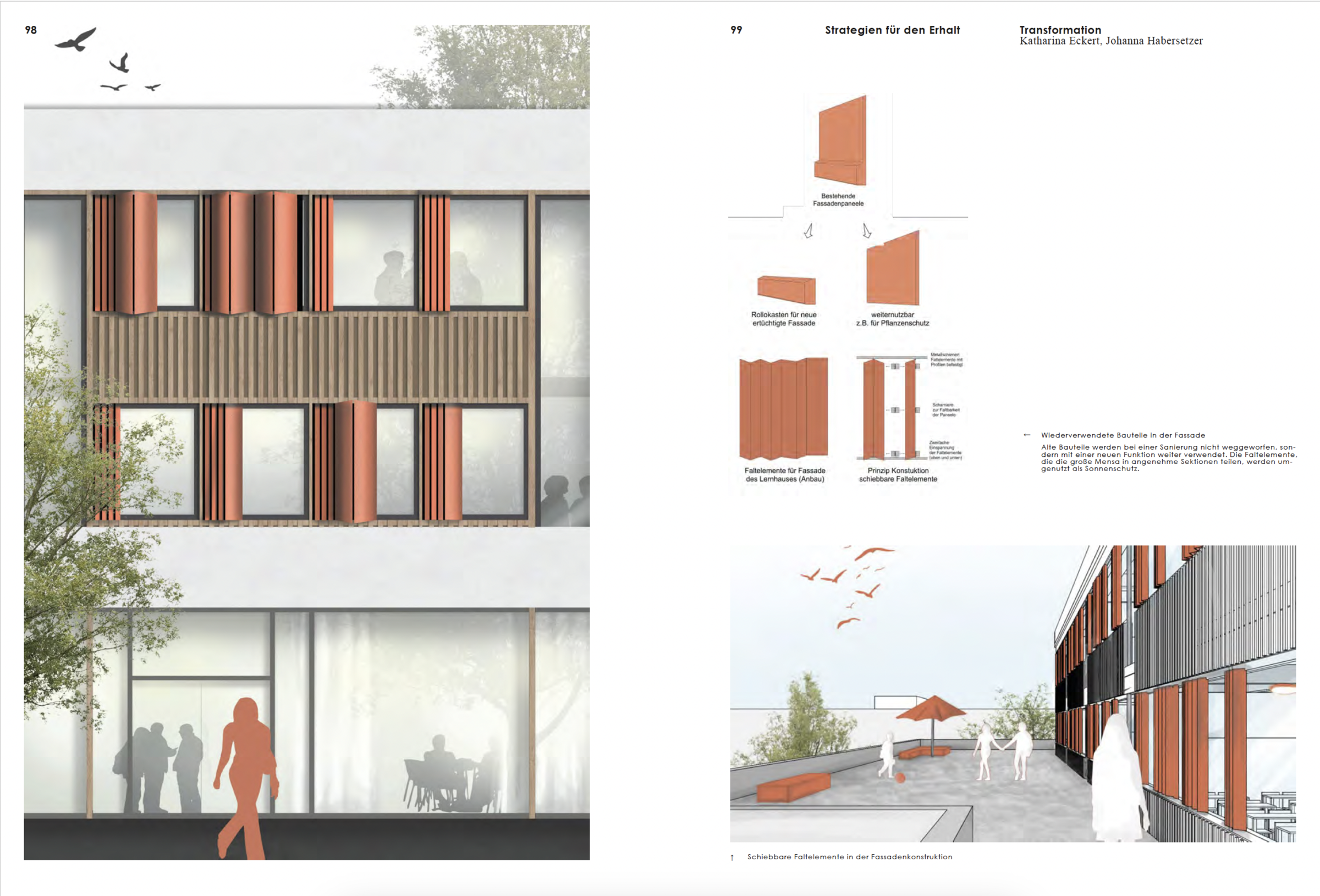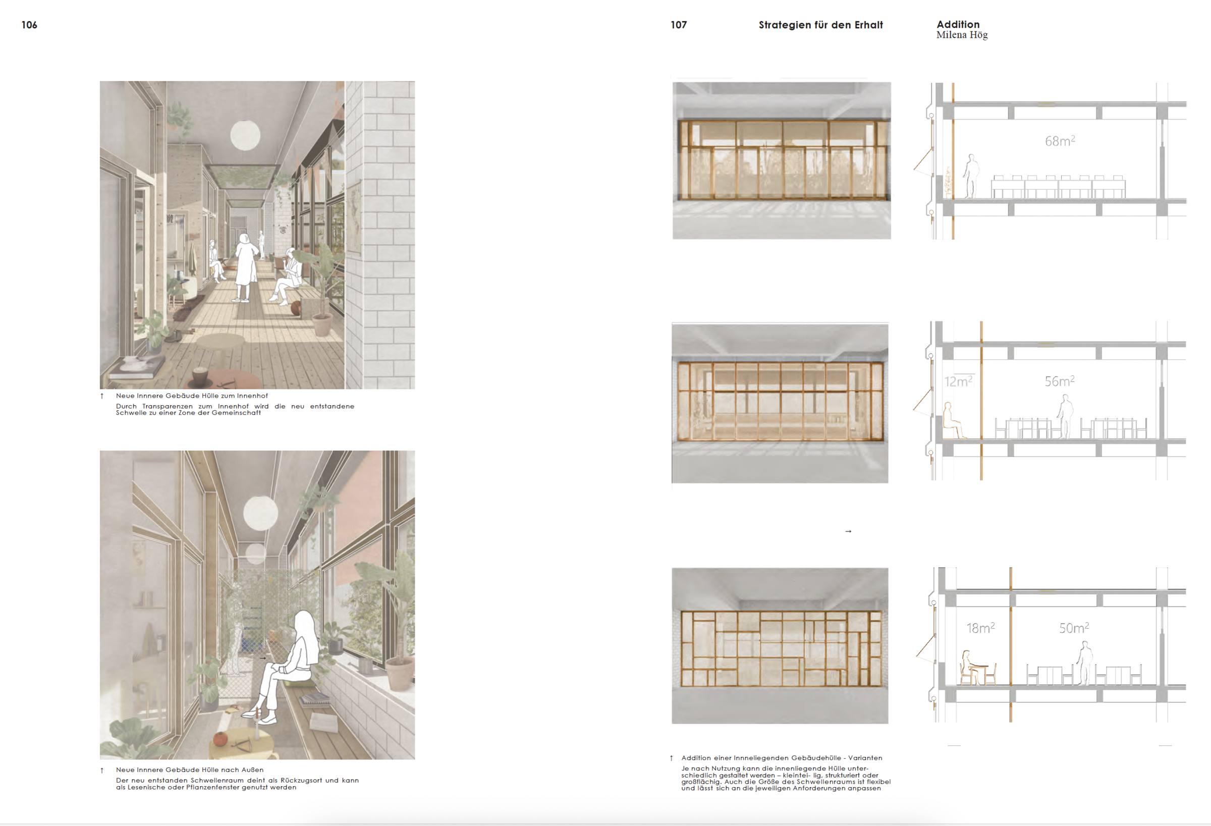 Die Wertschätzungsanalyse schlägt fünf Strategien für einen Umgang mit dem Bestand vor: Reparatur, Subtraktion, Rekonstruktion, Transformation und Addition. Auch Kombinationen der Strategien sind möglich. Die Entwurfsarbeiten der Studierenden in dieser Publikation sind dementsprechend eingeordnet.