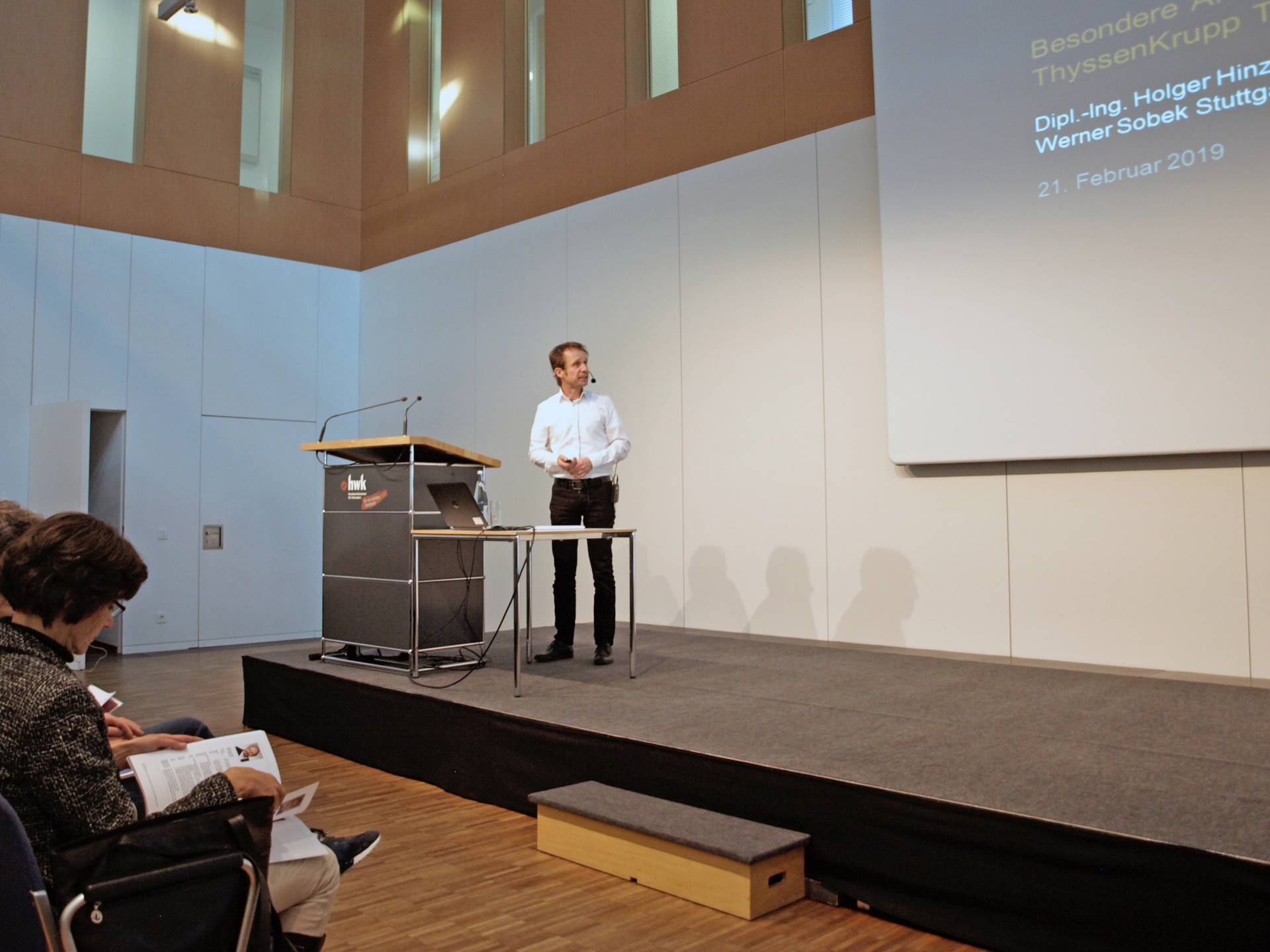 Holger Hinz, (Teamleiter und Prokurist der Werner Sobek Stuttgart AG), erläuterte zum Auftakt der Tagung die besonderen Herausforderungen bei der Planung und Realisierung des Testturms Rottweil. Die textile Bekleidung des 246 Meter hohen Turms überzeugt nicht nur durch die außergewöhnliche Anmutungsqualität, sie erfüllt auch konkrete konstruktive Anforderungen. Zum einen bietet die textile Verkleidung einen Witterungsschutz. Sie verschattet die Betonstruktur und reduziert so die durch Sonneneinstrahlung induzierten, teilweise erheblichen Spannungen. Zum anderen entsteht durch die spiralförmige Anordnung eine sogenannte Scruton-Wendel. Diese beeinflusst die Wirbelablösung am Turm und verringert die Beanspruchung durch Querschwingungen um ca. 40 %.