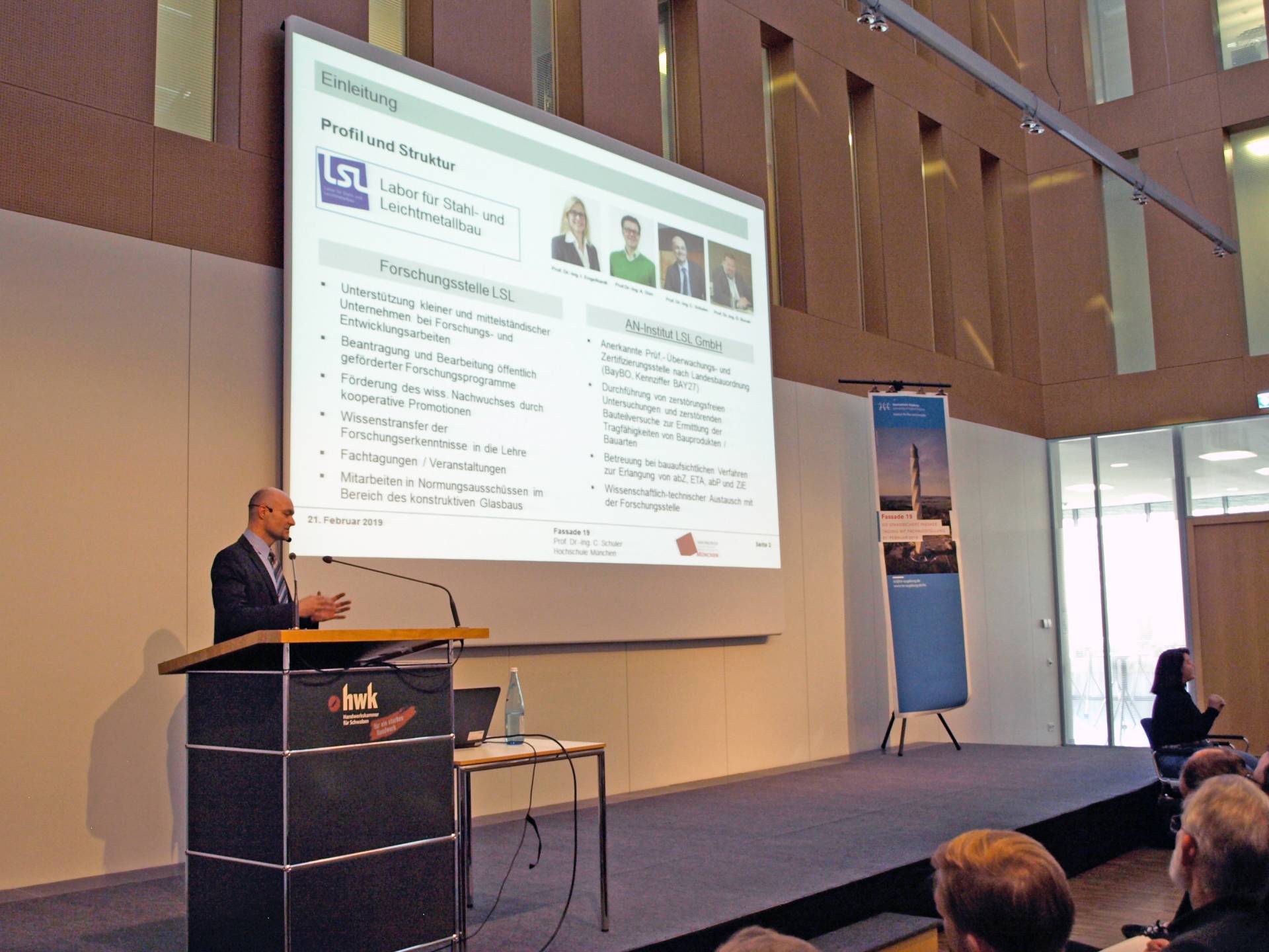 Den diskussionsintensiven Prozess der Homogenisierung der europäischen Normenwelt, gegebenenfalls auch die notwendigen Kompromisse im Vergleich zur bisherigen nationalen Normung erläuterte Prof. Dr. Christian Schuler (Professor für Glas- und Fassadenbau an der Hochschule München) im Vortrag “Bemessung und Befestigung von Glaselementen – Nationale Anwendung versus europäische Bemessung“ anhand der E DIN 18008 T1/T2 im Vergleich zu E DIN EN 16612 und EC 11.