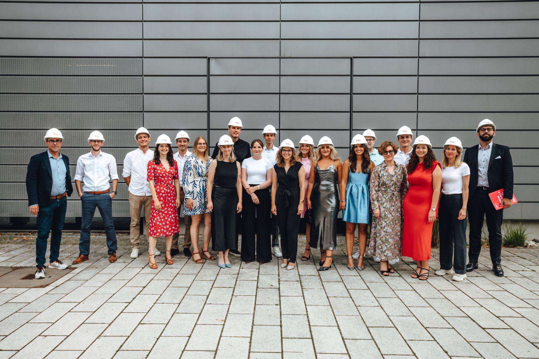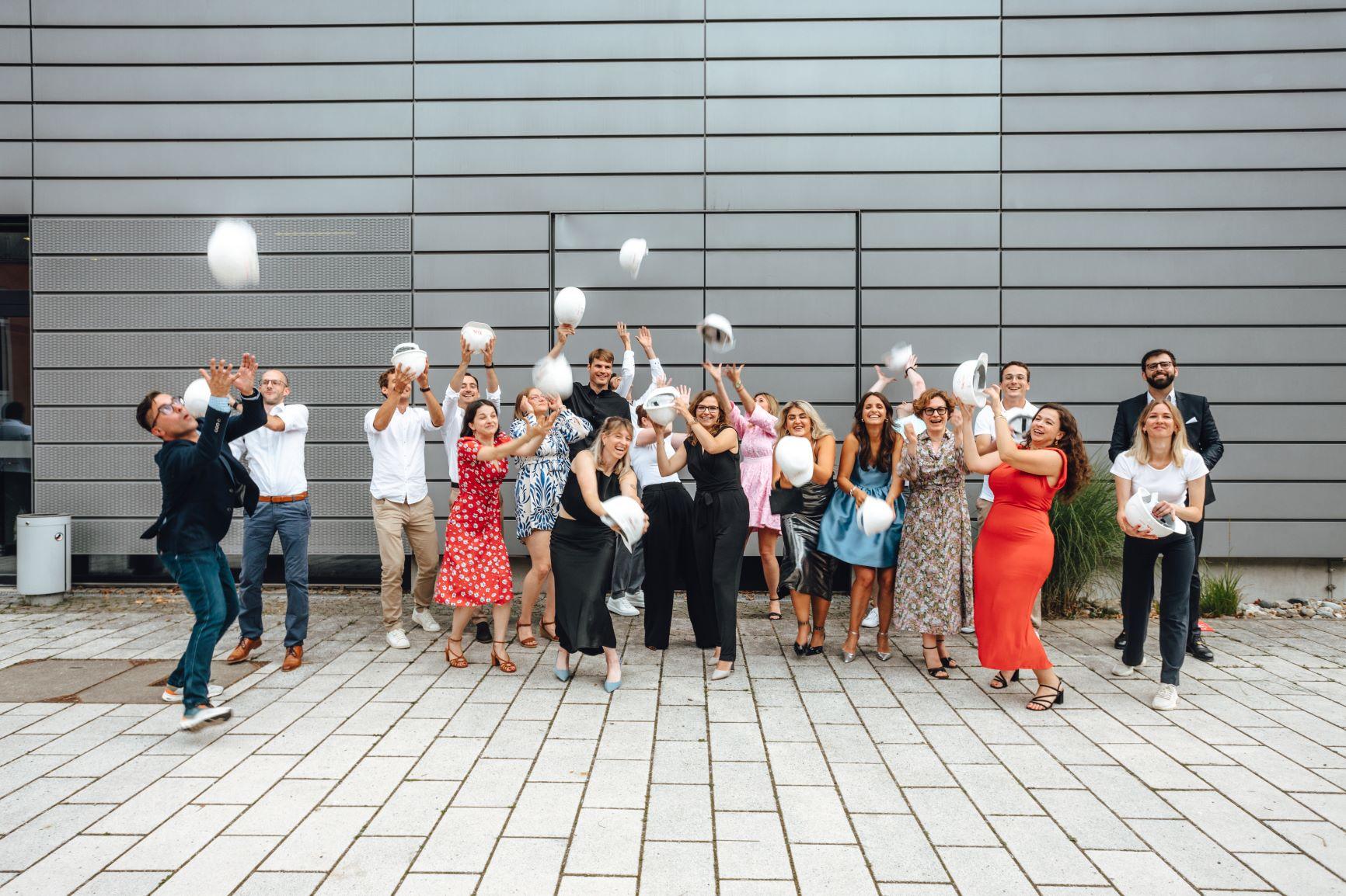 Der Jubel war groß: Die Absolventinnen und Absolventen warfen die traditionellen Masterhelme nach fünf Semestern berufsbegleitendem Studium Projektmanagement Bau voller Freude in die Luft. Die Studiengangsleiterin Prof. Dr. Elisabeth Krön gratulierte herzlich.