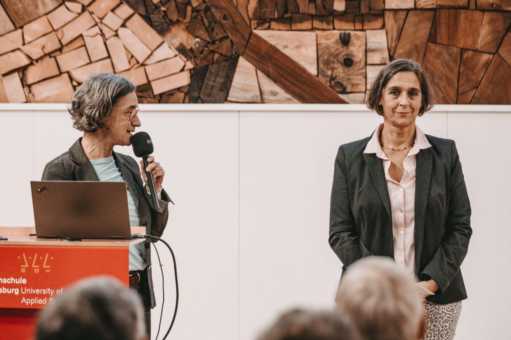 Neben der Preisträgerin präsentierten Corinna Rahm und Robert Krannich die zentralen Erkenntnisse ihrer Abschlussarbeiten an diesem Abend einem größeren Zuhörerkreis. Auf dem Programm stand auch der Absolvententalk. Die Institutsleiterin und Studiengangsleiterin des Masterstudiengangs, Frau Prof. Dr. Krön, lud anlässlich des Instituts-Jubiläums Alumni der Bau-Weiterbildungsstudiengänge ein. Prof. Dr. Jürgen Huber moderierte die Talkrunde. Thomas Berger, M.Eng., Absolvent 2000, Dr.-Ing. Magdalena Szablewska, M.Eng., Absolventin 2013, Ferhad Hesso, M.Eng., Absolvent 2016, Dr.-Ing. Jan Dirk van der Word, Absolvent 2020 und Constanze Walter, M.Eng., Absolventin 2019 berichteten über persönliche Herausforderungen und Bereicherungen während und nach dem Weiterbildungsstudium aus Alumnisicht.
