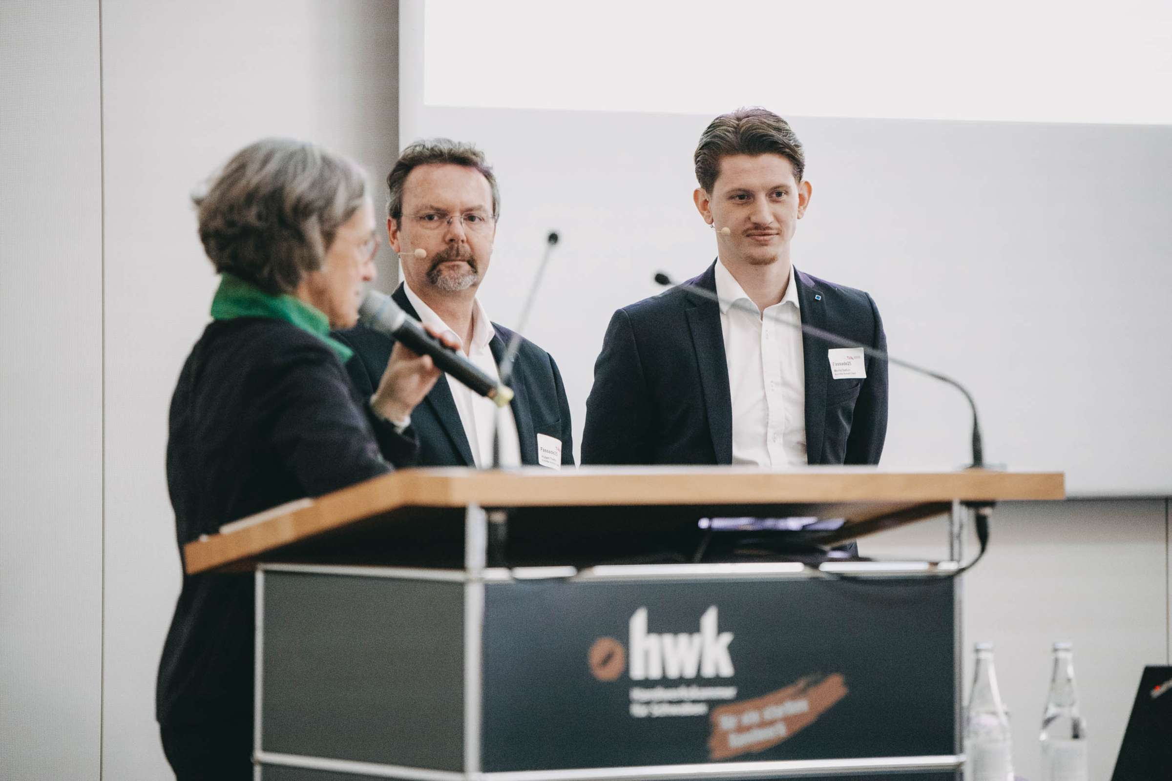 Den Auftakt der Veranstaltung macht Prof. Lucio Blandini, Institutsleiter des ILEK, Institut für Leichtbau, Entwerfen und Konstruieren und Partner der Werner Sobek AG. Er stellt den Tagungsgästen den Forschungsturm des ILEK vor, der in jedem Stockwerk eine andere Hülle trägt. An diesen Hüllen wird praxisnahe Forschung betrieben, um ressourcen- und klimaschonendes sowie kreislauffähiges Bauen zu realisieren. Besonders innovativ: Die „HydroSkin“. Diese Fassade nimmt Wasser bei Starkregenereignissen auf und speichert das Regenwasser, um es in Hitzeperioden über Düsen wieder abzugeben.