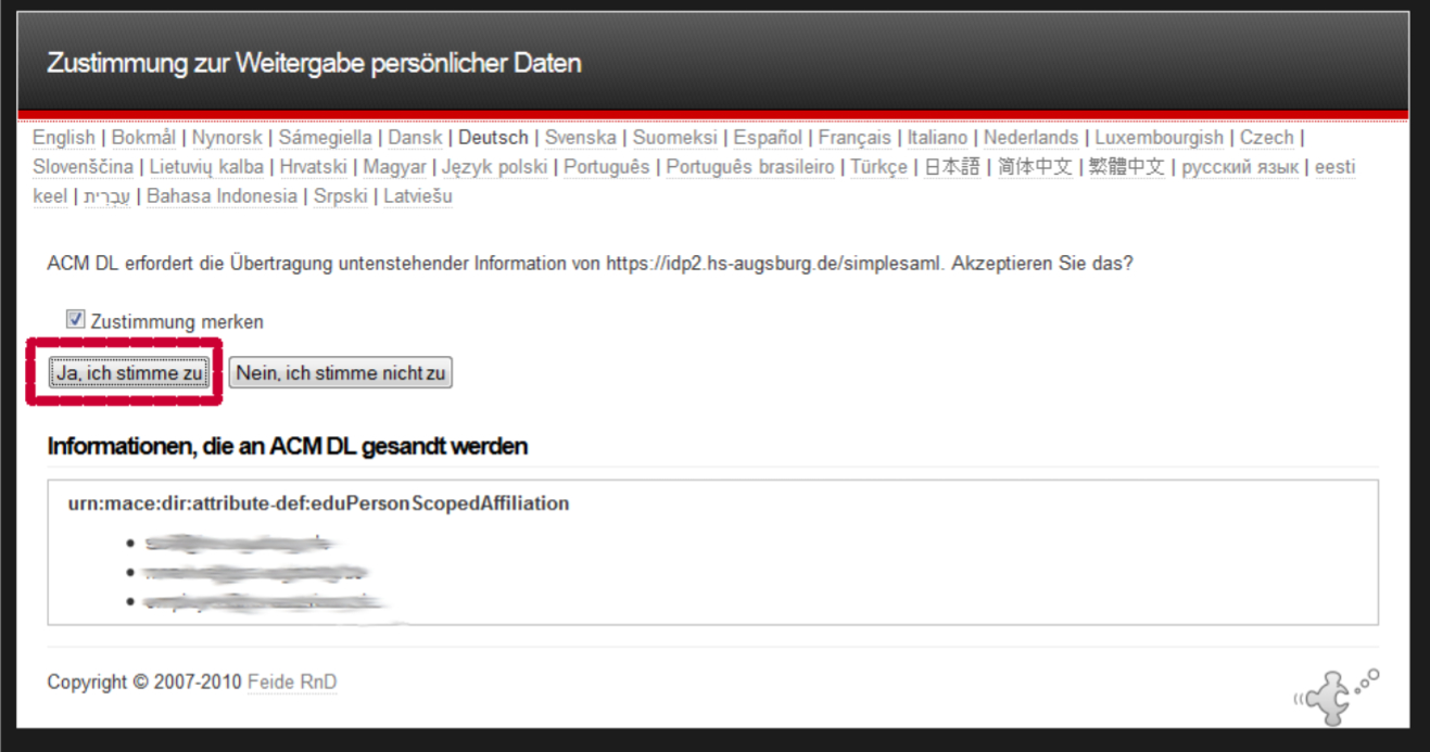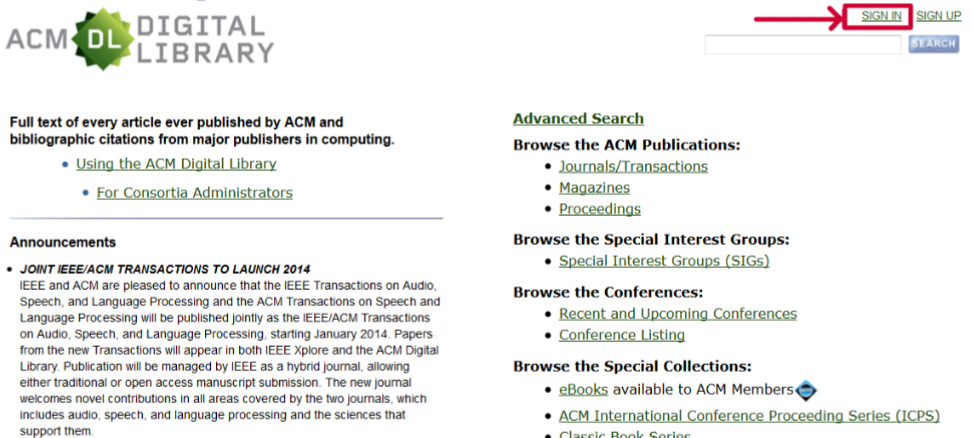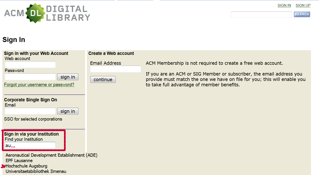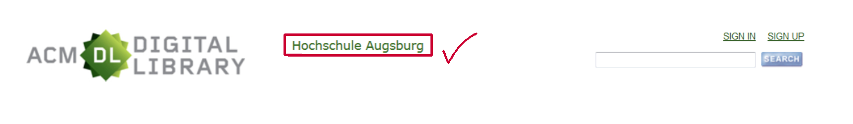 Sie werden nun auf die Startseite von ACM weitergeleitet. Sie erkennen an dem Schriftzug „Hochschule Augsburg“ neben dem ACM-Logo, ob der Login funktioniert hat. Nun können Sie mit Ihrer Recherche beginnen und auf die lizenzierten Volltexte zugreifen.