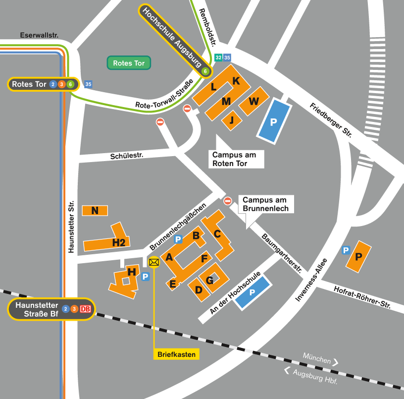 - P&R-Plätze Friedberg-West oder Bahnhof-Hochzoll: Straßenbahnlinie 6 bis Hochschule, von dort aus ca. 8 Gehminuten bis zur Bibliothek oder mit Linie 6 eine Station weiter bis Rotes Tor, dann umsteigen in Linie 2 oder 3 bis Haunstetter Straße