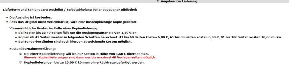 7. a) Angaben zur Kostenübernahme: die Bestellung ganzer Bücher ist kostenlos. Wünschen Sie eine Kopie eines einzelnen Kapitels oder ist das Buch nicht verleihbar (kommt so gut wie nie vor), fallen Gebühren an (1,50€). Die höheren Kosten für mehr als 40 Seiten entfallen seit dem 1.3.2018.