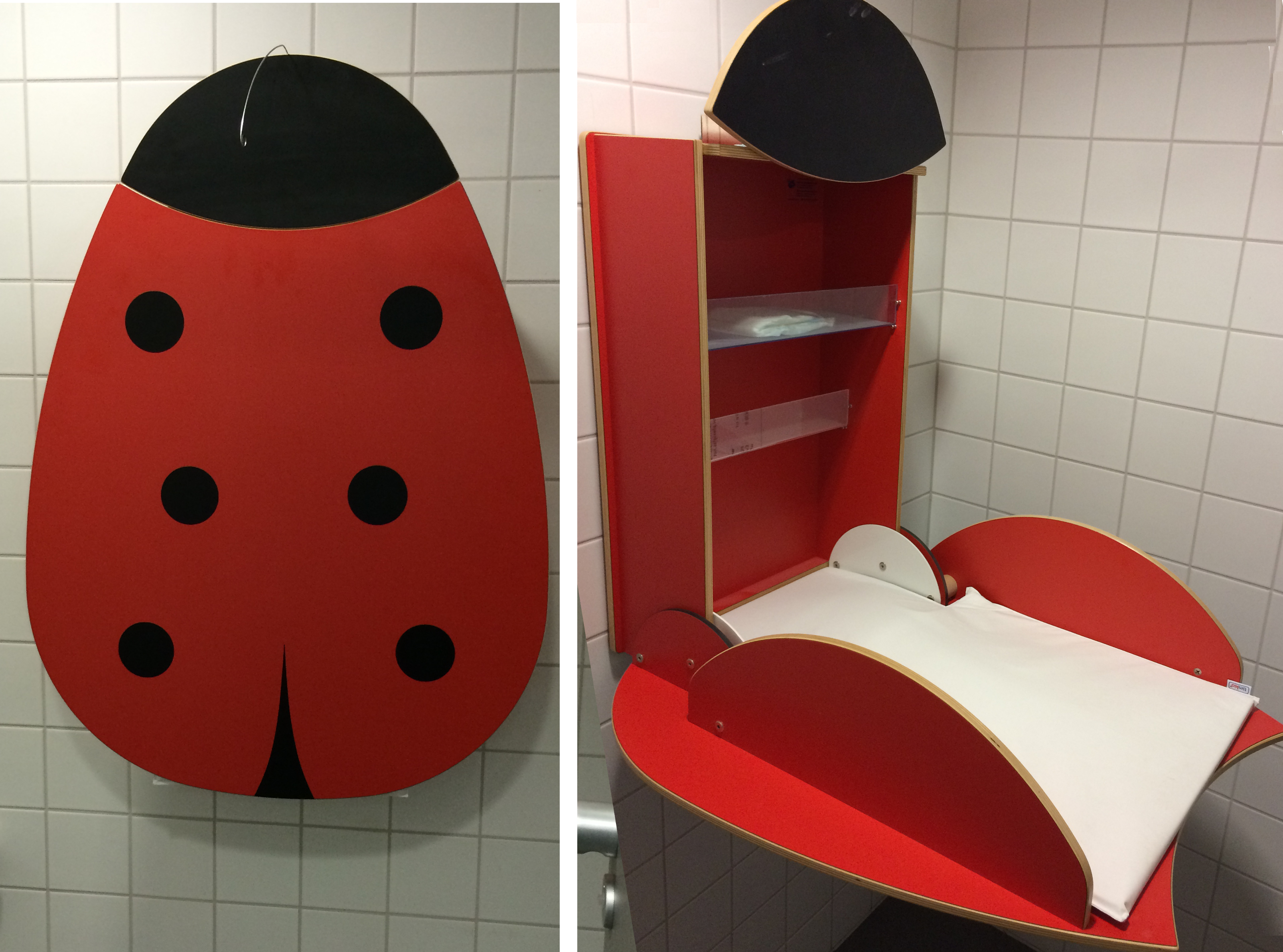 Auf der Damentoilette der Bibliothek steht Ihnen einen "Wickelkäfer" zur Verfügung. Mit diesem können junge Familien ihre Kinder in der Bibliothek wickeln.