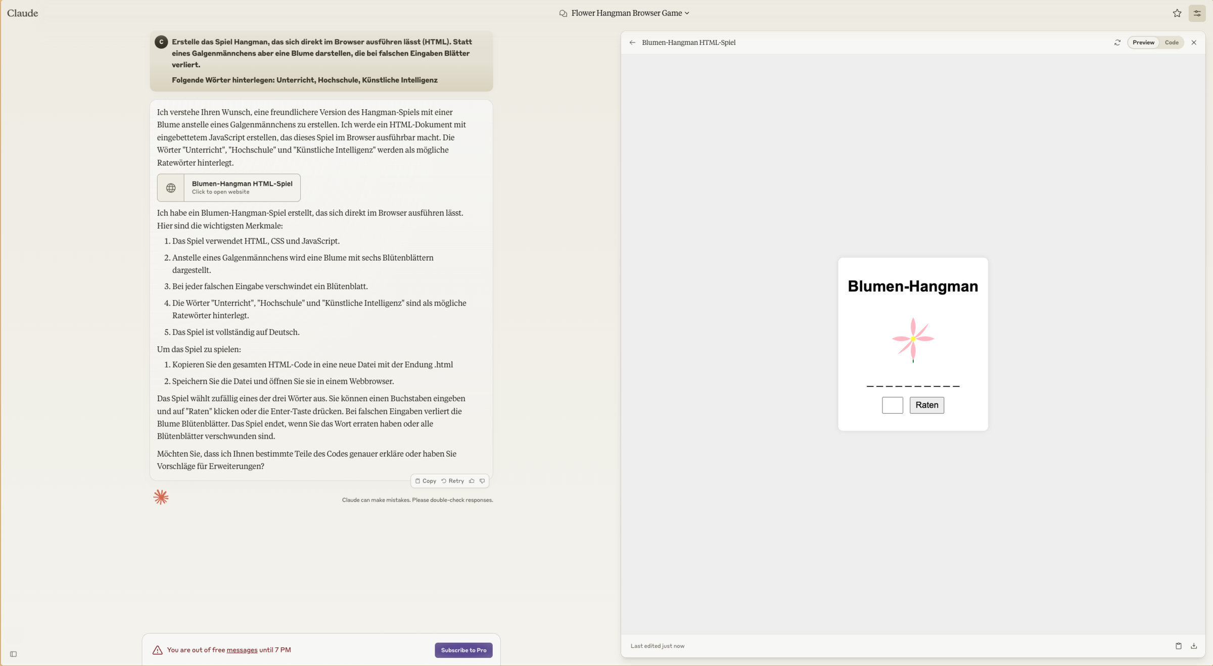 - Lehre: Die „Artifacts“-Funktion ermöglicht, Inhalte iterativ zu bearbeiten und z. B. Lernspiele für einen interaktiven Unterricht zu erstellen. Der Output wird neben dem Gesprächsverlauf angezeigt und bei weiteren Eingaben wird das Ergebnis entsprechend angepasst. Nutzende können für einen kreativen Arbeitsprozess zwischen verschiedenen Ergebnissen wechseln. Die Funktion ist vergleichbar mit dem Feature „Canvas“ bei ChatGPT.