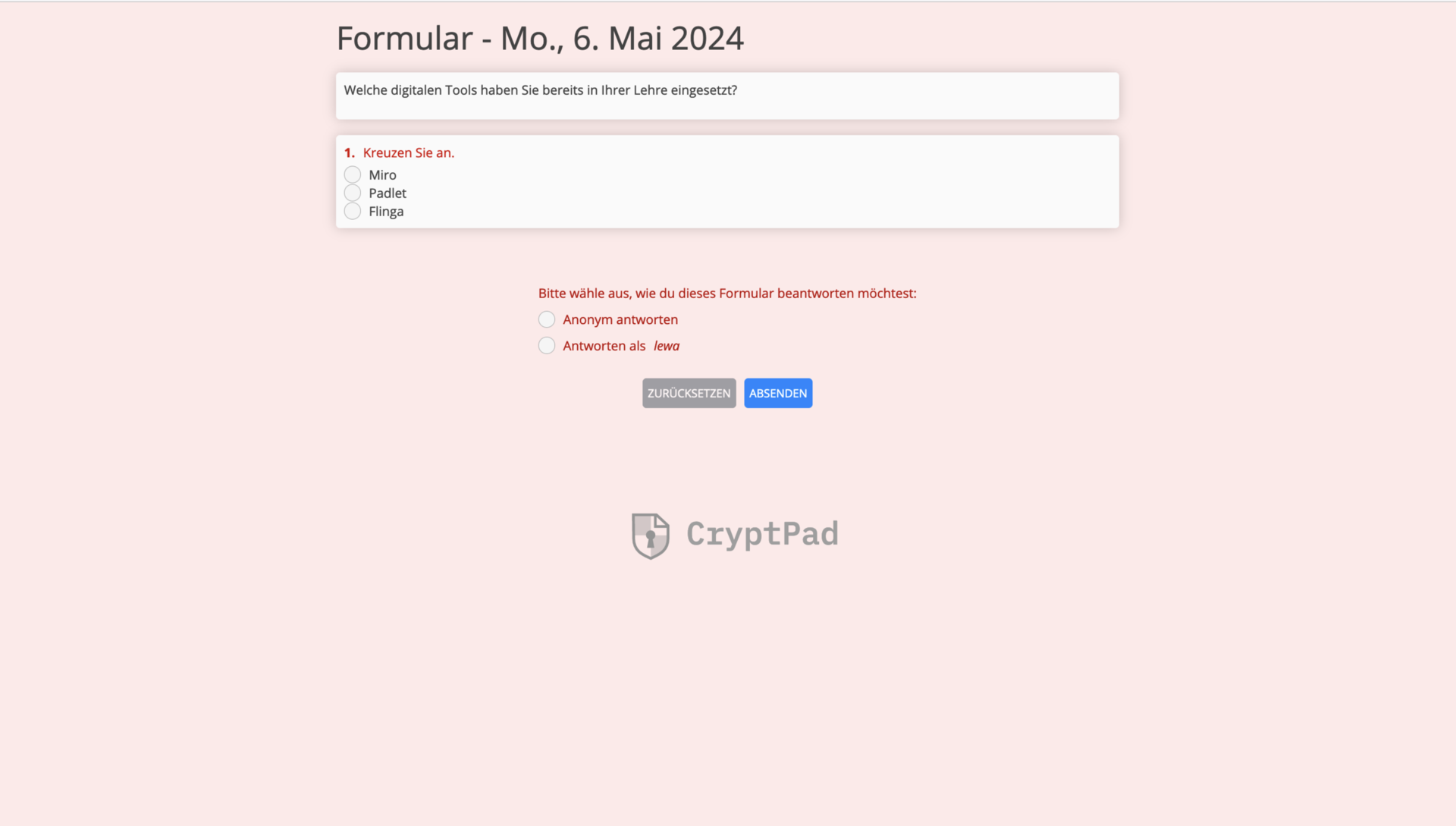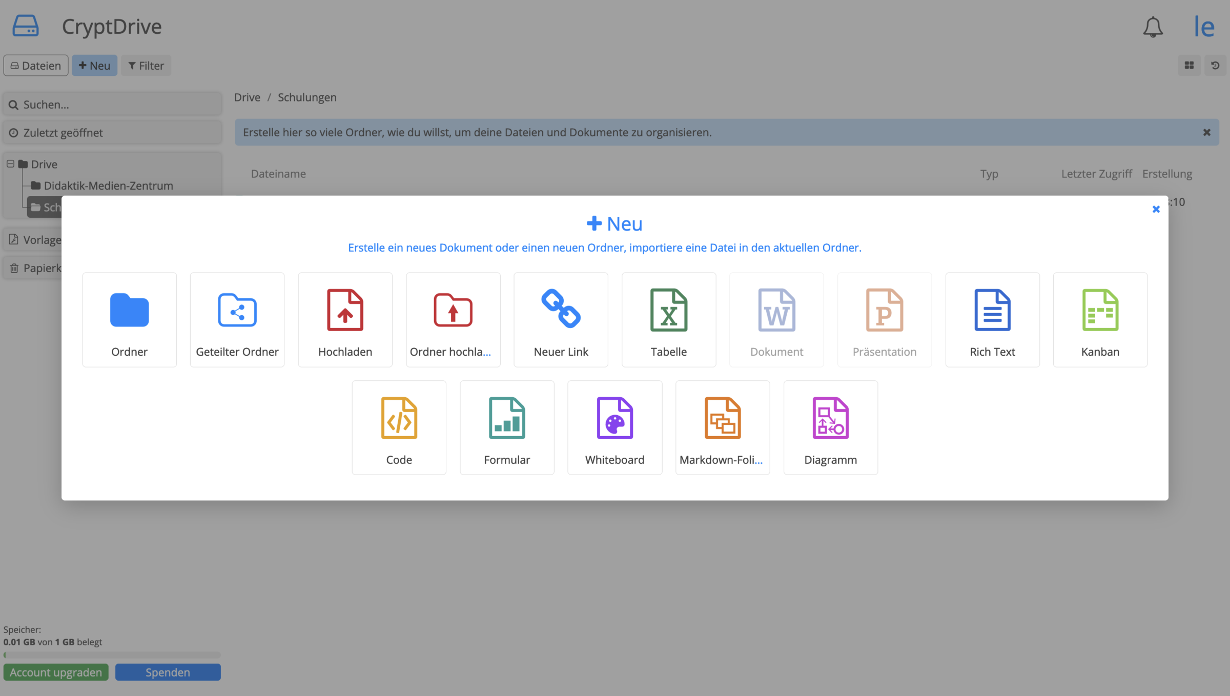 CryptPad ist ein kostenloses, browserbasiertes Kollaborationstool, mit dem Dokumente in Echtzeit erstellt und bearbeitet werden können. Mit CryptPad können Teams gemeinsam an Textdokumenten, Tabellen, Präsentationen und Codes arbeiten, während sie keine persönlichen Daten für die Anwendung freigeben müssen. CryptPad empfiehlt zur reibungslosen Nutzung die Browser Firefox und Chromium.