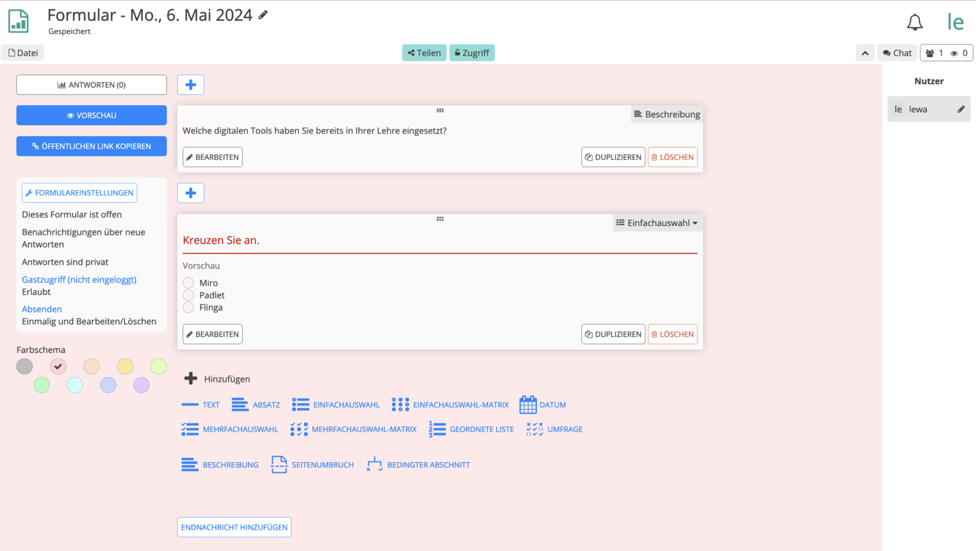- Inhalte erstellen: Textdokumente, (erweiterte) Tabellenkalkulationen, Präsentationen, Umfragen, etc.