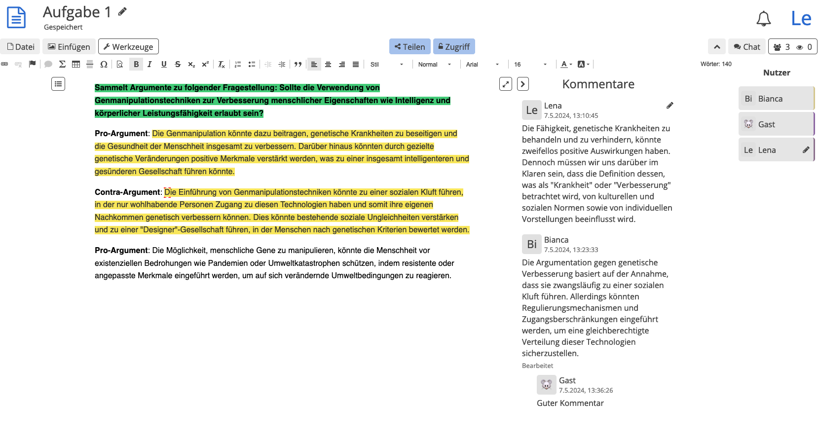 - Kommentare und Diskussionen: Nutzende können Kommentare direkt im Dokument hinterlassen, um eine detaillierte Diskussion und Feedback zu ermöglichen.