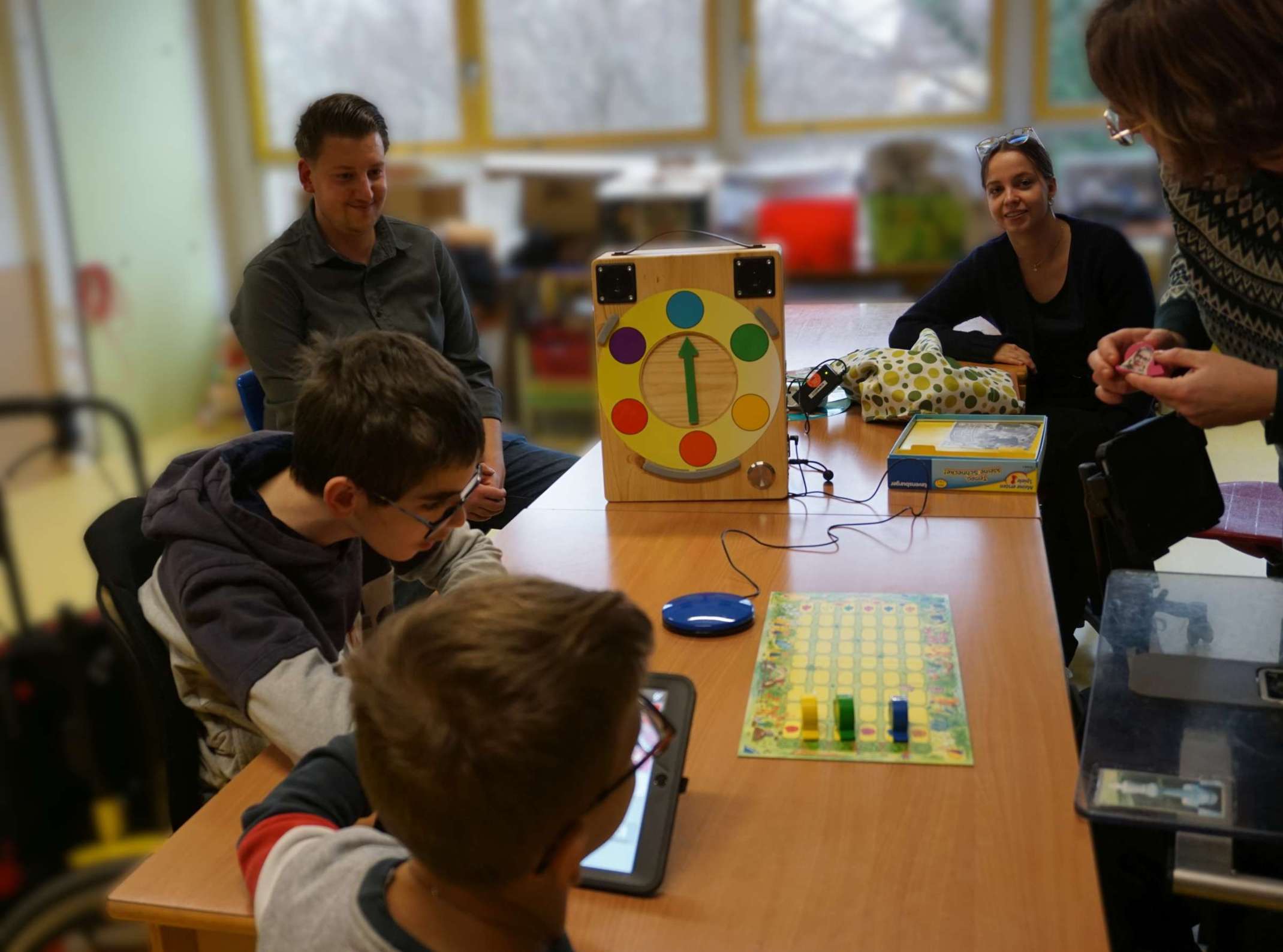 Bei der Übergabe des Geräts fand zunächst eine kurze Schulung für die Betreuerinnen des Fritz-Felsenstein-Hauses durch die Studierenden Anika Leinauer und Phillip Müller statt, die die Spracheingabe für das Gerät entwickelt haben. Anschließend wurde der rotierende Zeiger mit großer Begeisterung von einigen Schülern des Fritz-Felsenstein-Hauses ausprobiert.