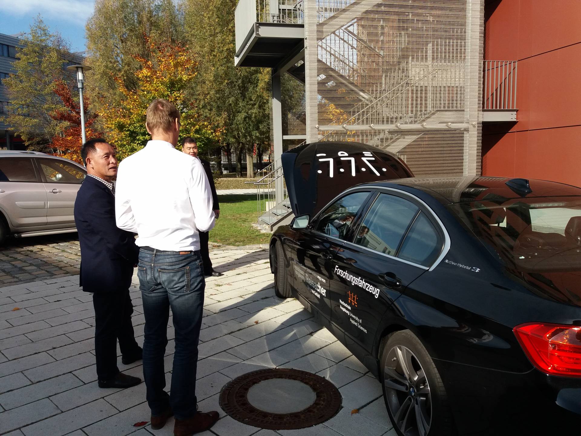 Die Besucher wurden von Vizepräsident Prof. Dr. Manfred Uhl, von Dekan Prof. Dr.-Ing. Wolfgang Zeller und von Prof. Dr.-Ing. Franz Raps empfangen und über den Campus geführt. Unter anderem wurde zusammen mit Prof. Dr.-Ing. Carsten Markgraf das Forschungsfahrzeug für autonomes Fahren besichtigt.