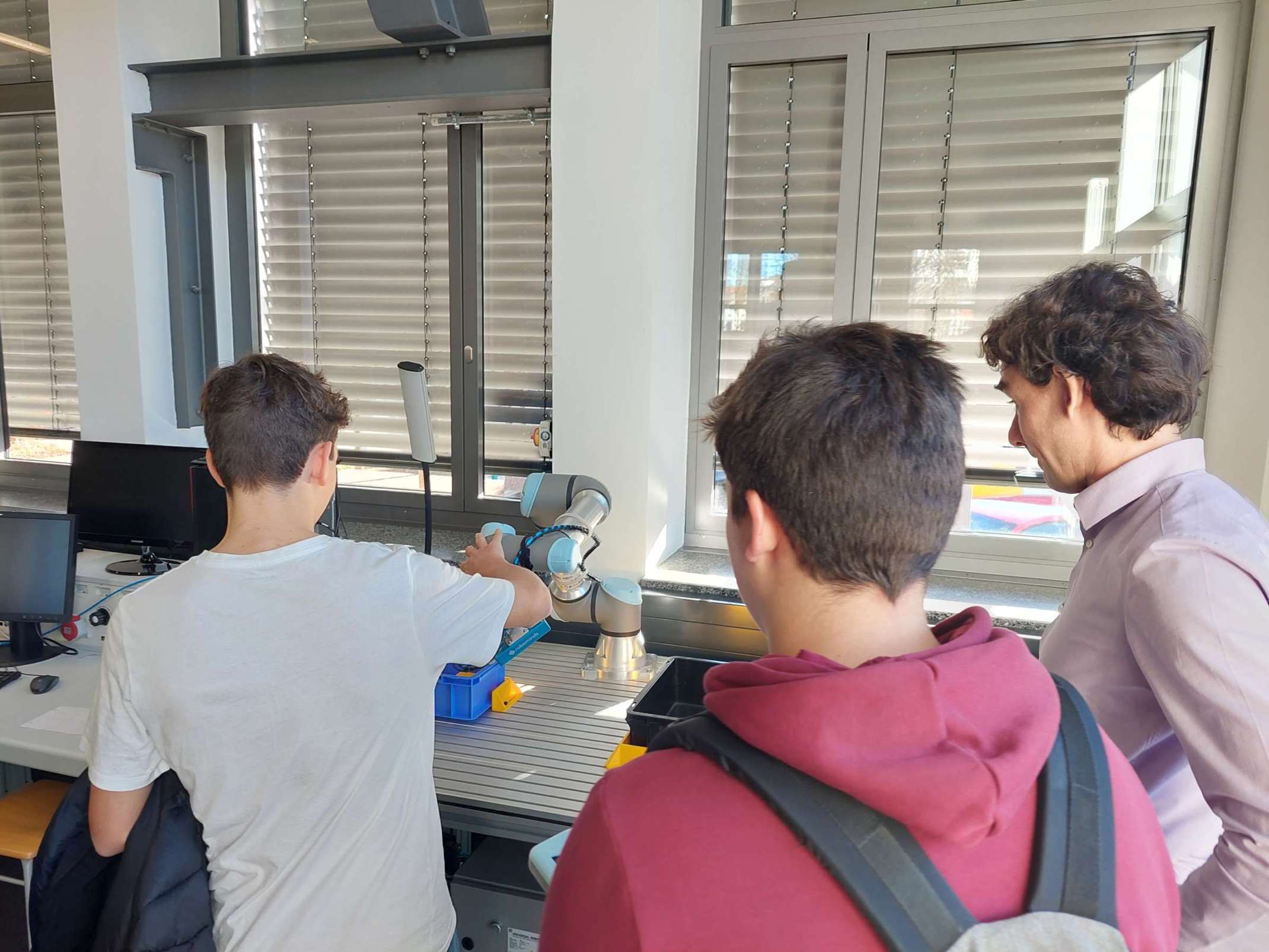 Am Campus am Brunnenlech ging es los. An der Pyramide wurde eine kleine Gruppe interessierter Schüler:innen von den Studienbotschaftern der Fakultät für Elektrotechnik in Empfang genommen. Nach einer kurzen Führung durch die Fakultät konnten die Schülerinnen und Schüler an der Elektrotechnik 1 Vorlesung von Professor Wolfgang Meyer teilnehmen und so den Vorlesungsbetrieb an der Hochschule live erleben. Danach ging es weiter in die Labore für Mikrocomputertechnik zu Professor Christoph Zeuke und das RoboticsLab von Professor Simon Dietrich. Was kann man mit einem Mikrocontroller alles machen? Auf diese spannende Frage gab es im Labor für Mikrocomputertechnik nicht nur Antworten, sondern auch einige Studierendenprojekte zum Anfassen und Ausprobieren. So konnten beispielsweise die Senso Sticks, ein Projekt für das Fritz-Felsenstein-Haus, getestet werden und vermittelten den Schüler:innen eindrücklich wie sich Ingenieurleistungen und soziales Engagement miteinander vereinen lassen. Dass mit einen Ingenieurstudium eine ganze Bandbreite an Zukunftsthemen und beruflichen Optionen abgedeckt werden kann, von erneuerbaren Energien, nachhaltiger Entwicklung bis hin zu sinnstiftendem Engagement, davon konnten sich die Schüler:innen auch im RoboticsLab überzeugen. Als kleines Highlight konnten sie hier einen Roboter ganz ohne Programmiersprache programmieren und resümierten danach, dass der Vormittag an der Fakultät für Elektrotechnik „in der Tat sehr lehrreich“ war. Wir freuen uns schon auf den nächsten Besuch der Schülerinnen und Schüler von St. Stephan – und natürlich auch von allen anderen Schulen rund um Augsburg!