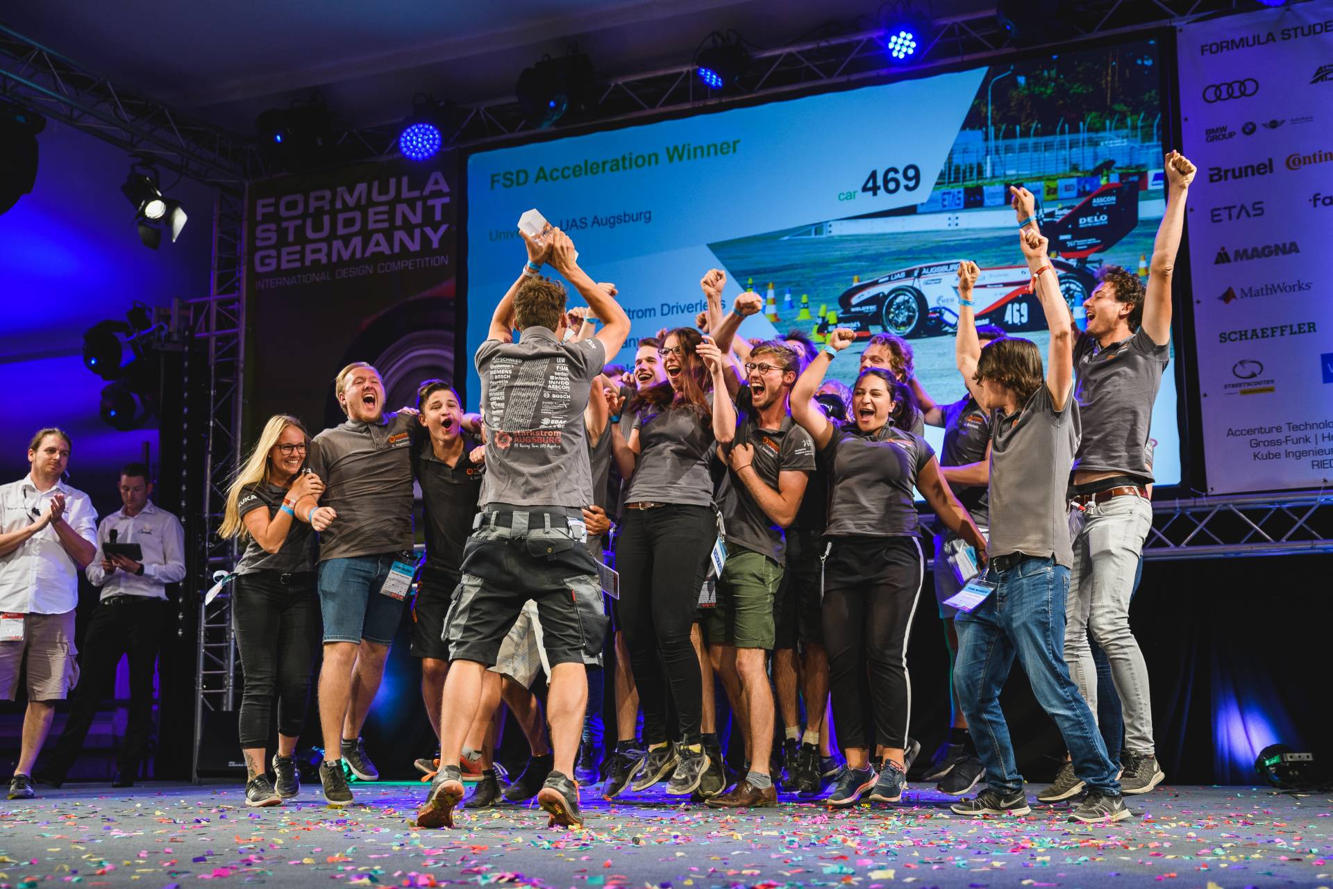 Bei der Formula Student Germany traten vom 6. bis 10. August 2018 105 Hochschulteams aus der ganzen Welt mit ihren selbst konstruierten Rennwagen in drei Klassen (Verbrenner, Elektro, Driverless) in insgesamt sechs Disziplinen gegeneinander an. Mit ihrem fahrerlosen Rennwagen Fenja-Driverless überzeugte Starkstrom vor allem in der Disziplin Acceleration: Dabei musste der Rennwagen eine 75 Meter lange Strecke möglichst schnell aus dem Stand zurücklegen. Mit einer Zeit von 4,27 Sekunden und einer Höchstgeschwindigkeit von 95 km/h erreichten die Augsburger hier den ersten Platz.