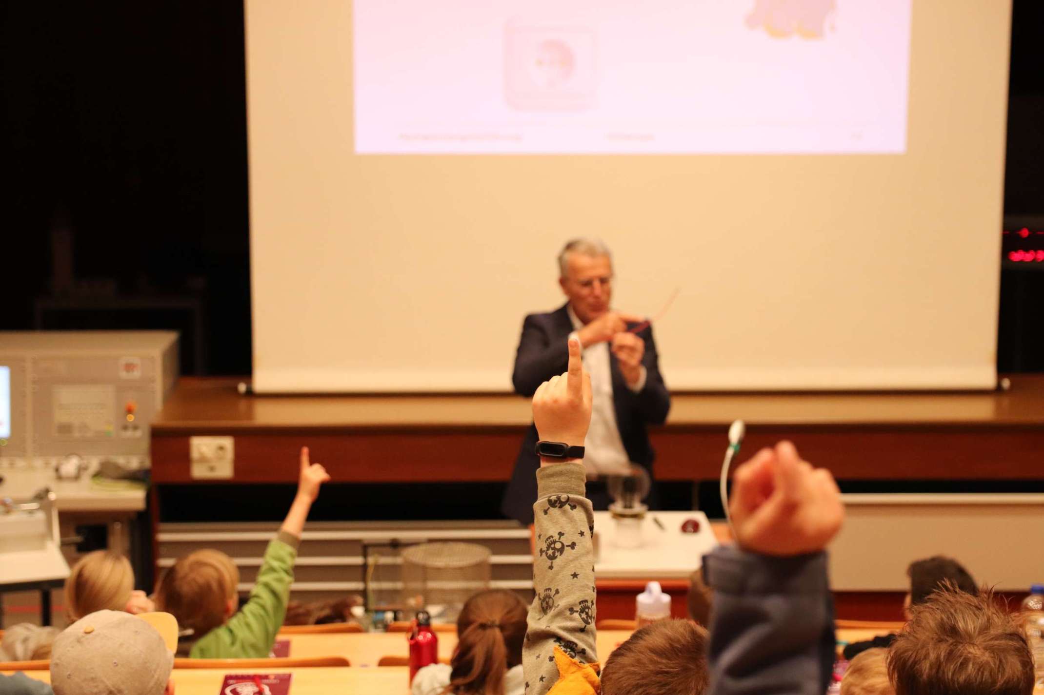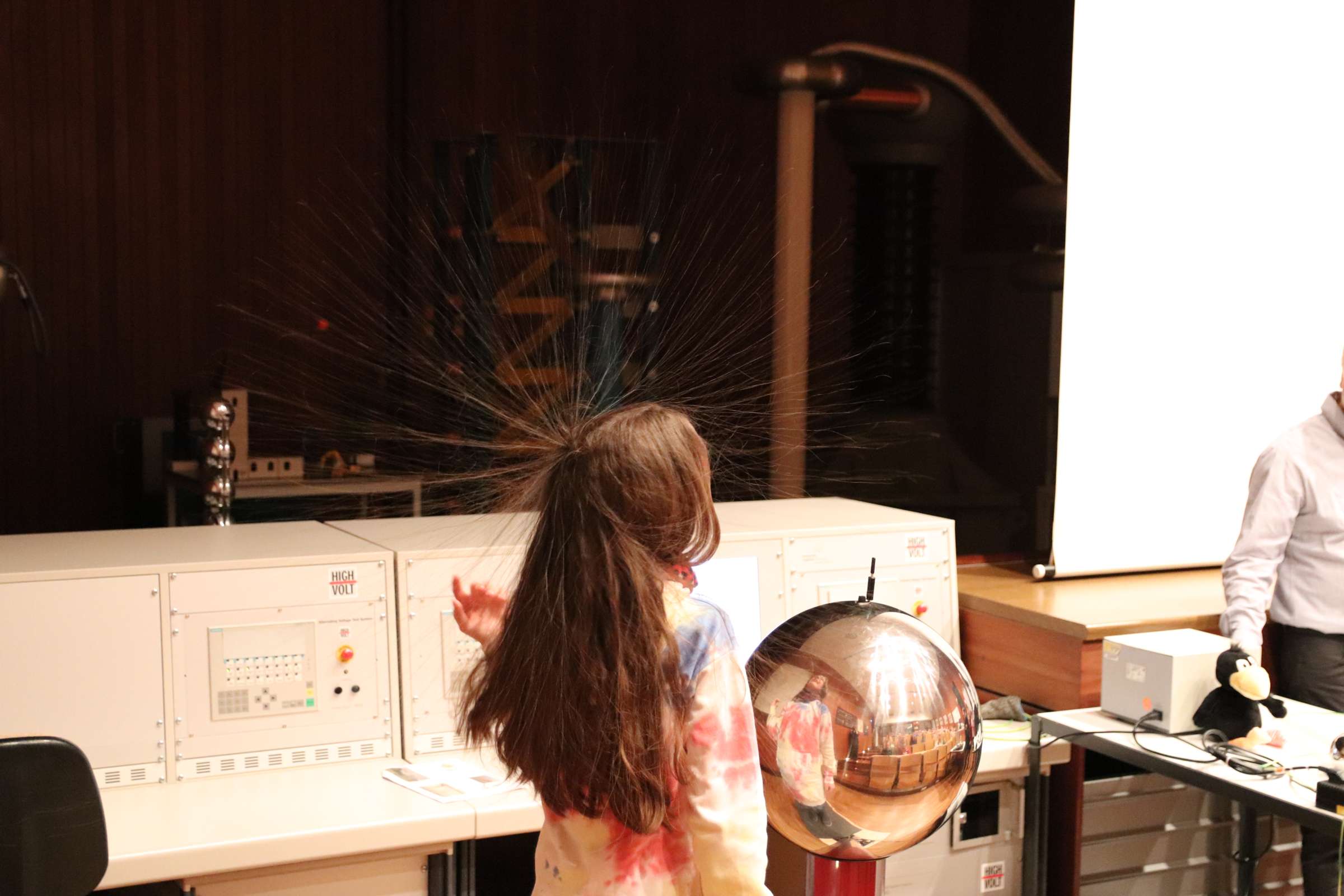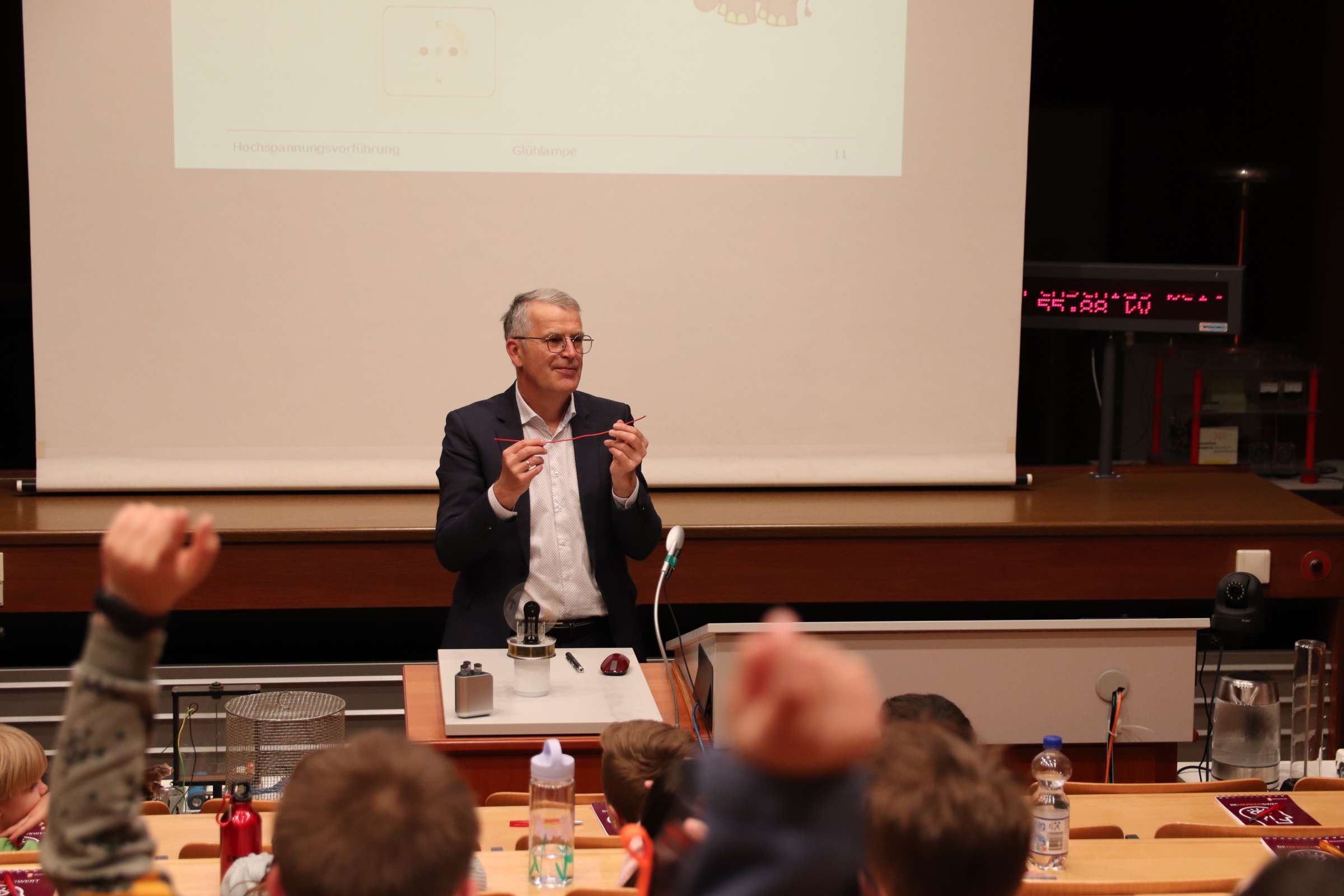 Am 3. April 2024 führte Professor Dr. Michael Finkel, zusammen mit den Laboringenieuren Herrn Holzmann und Herrn Weiner, im LEW-Hochspannungssaal an der Technischen Hochschule Augsburg wieder hochspannende Experimente durch. Dabei beschäftigten sich die Schülerinnen und Schüler der dritten und vierten Klassen aktiv mit Themen aus Naturwissenschaft und Technik und lernten viel Wissenswertes, aber auch Spannendes über das Thema Elektrizität. Im ersten Teil der Kindervorlesung wurden physikalische Phänomene und Zusammenhänge anhand von Experimenten anschaulich erklärt, während anschließend hochgeladene und beeindruckende Mitmach-Versuche folgten, an denen die Kinder mit großem Interesse teilnahmen.