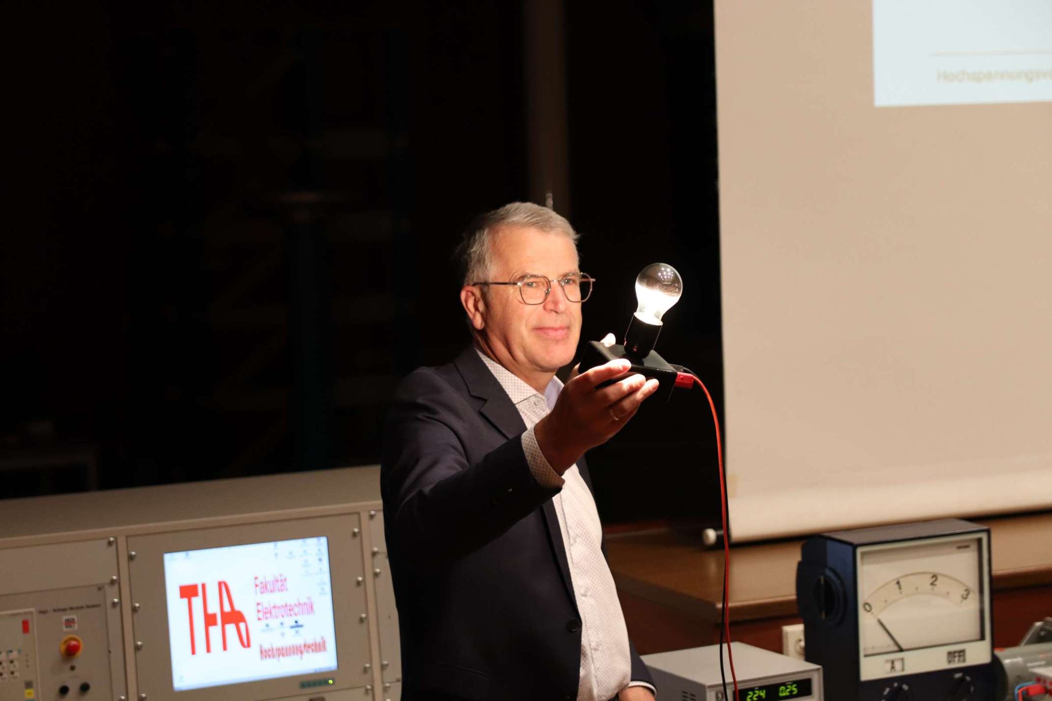 Prof. Dr. Michael Finkel gestaltet die Vorlesung rund um die Themen Energie und Elektrizität interaktiv und mit vielen Experimenten besonders spannend und anschaulich. Das Angebot gewährt den Kindern Einblicke in physikalische Phänomene und Zusammenhänge und weckt Interesse und Neugier an Themen aus den Bereichen Mathematik, Informatik, Naturwissenschaft und Technik.