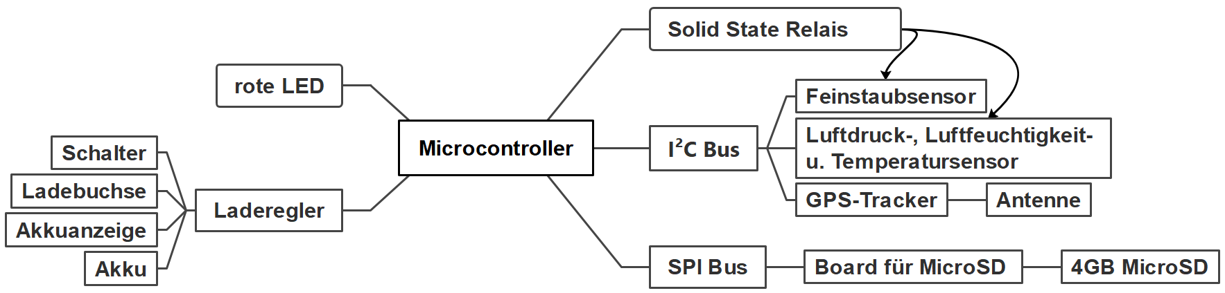 - Messung von Temperatur, Luftfeuchte, Luftdruck, Feinstaubbelastung und GPS-Standort mit Zeitstempel