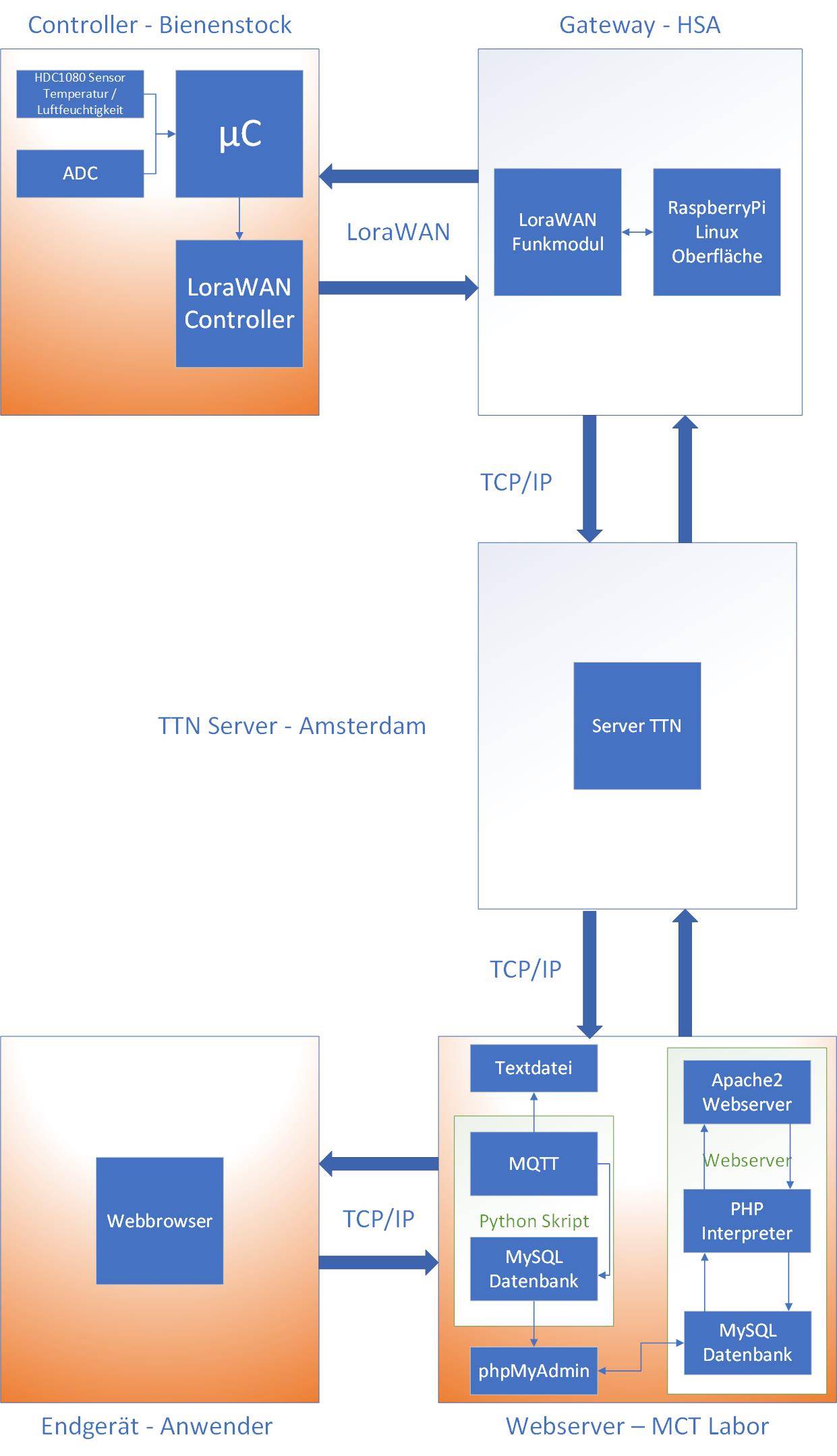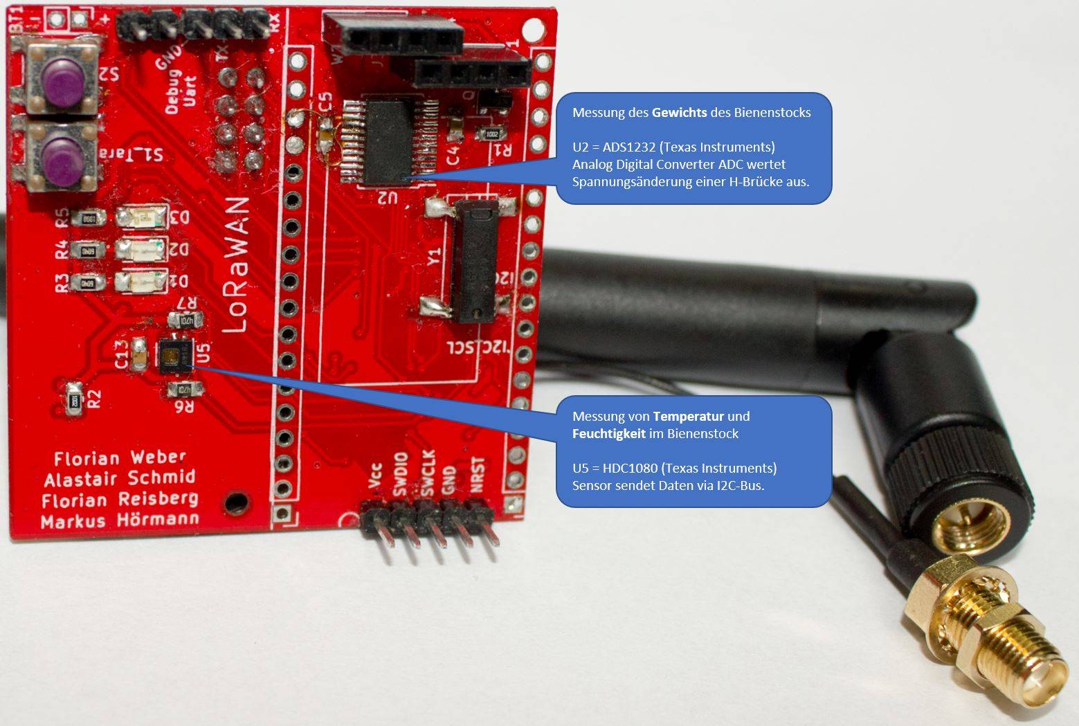 - Messung von Temperatur, Luftfeuchtigkeit (optional Gewicht) im Bienenstock