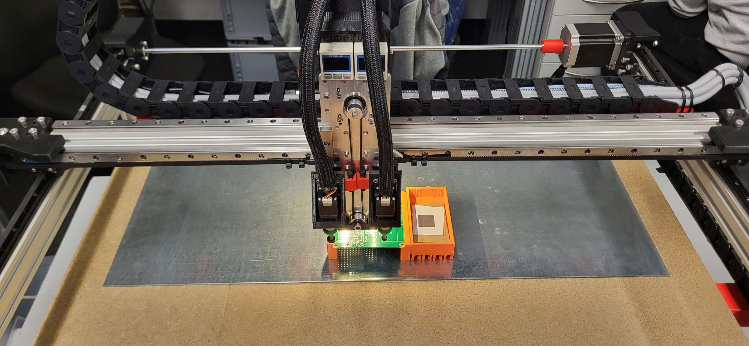 Ziel des Projektes war der Aufbau eines funktionsfähigen Bestückungsautomaten. In diesem sollen Platinen eingelegt werden, die im Anschluss durch das Gerät, mit Bauteilen bis zu einer minimalen Größe von SMD 0402, bestückt werden. Die Ansteuerung erfolgt über die Open-Source-Software „OpenPNP“. Aufgenommen werden die Bauteile automatisch, nachdem sie neben der Platine ausgelegt wurden.