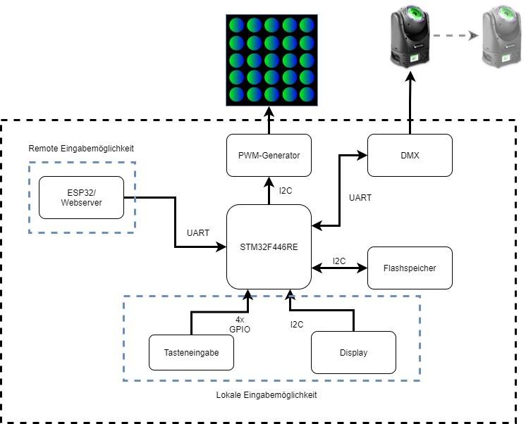 Ziel der Arbeit war es, mithilfe eines STM32F446RE und einem ESP32 sowohl die Ansteuerung eines Matrixscheinwerfers als auch ein Lichtstellpult zu implementieren. Der ESP32 ist hierbei für das Erstellen des Webservers eingesetzt. Das Lichtstellpult selbst wird über den STM32 realisiert. Die Kommunikation zwischen den beiden Prozessoren erfolgt über die Hardwareschnittstelle UART. Das Lichtstellpult hat bereits vorgefertigte Programme für den Matrixscheinwerfer abgespeichert, welche über ein Display und Tasteneingabe oder per Smartphone angewählt werden können. Weiterhin hat das Lichtstellpult die Möglichkeit, Beleuchtungsszenen für eine Veranstaltung aufzunehmen und zu speichern, um diese bei Bedarf abzuspielen.