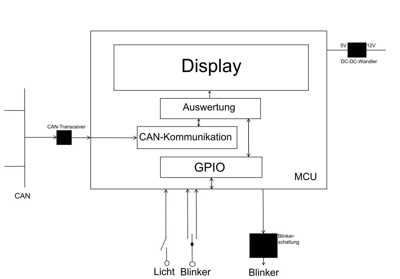 Auf dem Display sollen relevante Fahrparameter wie die aktuelle Geschwindigkeit, zurückgelegte und verbleibende Distanz oder der Status der Licht- und Blinkanlage angezeigt werden. Diese Informationen dienen der Sicherheit des Fahrers und anderer Verkehrsteilnehmer, weshalb die Daten möglichst verzögerungsfrei angezeigt werden müssen. Um den Fahrkomfort auch optisch zu erhöhen erfolgt die Anzeige über intuitive Animationen. Die vom Steuergerät über den Fahrzeuginternen CAN-Bus gesendeten Nachrichten werden vom im Display integrierten Mikrocontroller empfangen und dynamisch dargestellt.