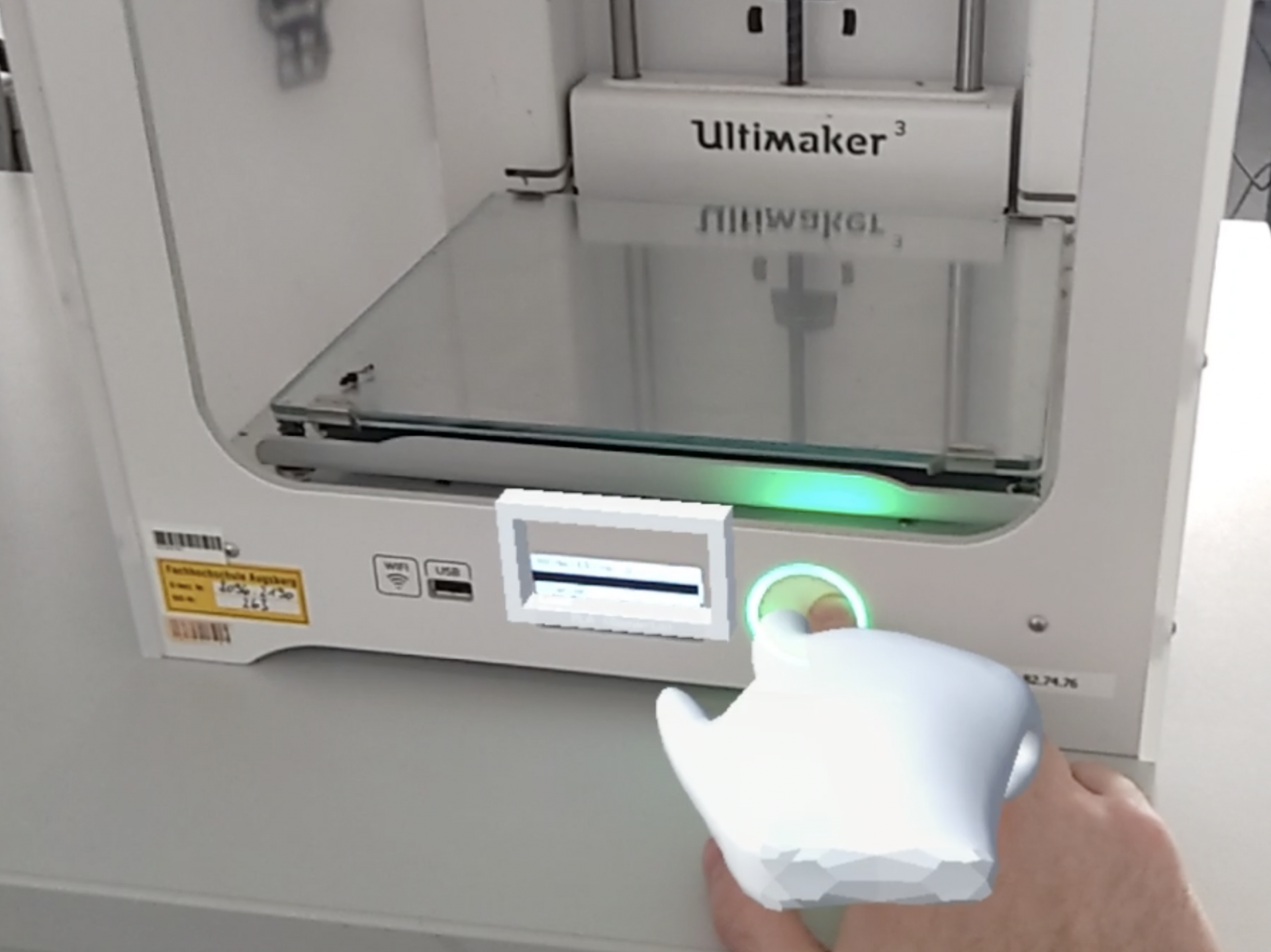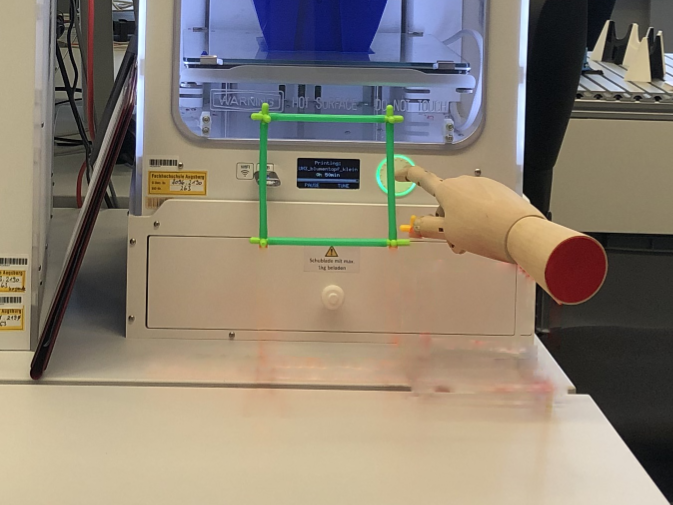Um diese Ergebnisse zu veranschaulichen, wird eine Anwendung für die AR-Brille Hololens 2 der Firma Microsoft entwickelt. Die App soll am 3D-Drucker "Ultimaker 3" zu jedem Schritt, der für einen Materialwechsel nötig ist, passende Hinweise geben.