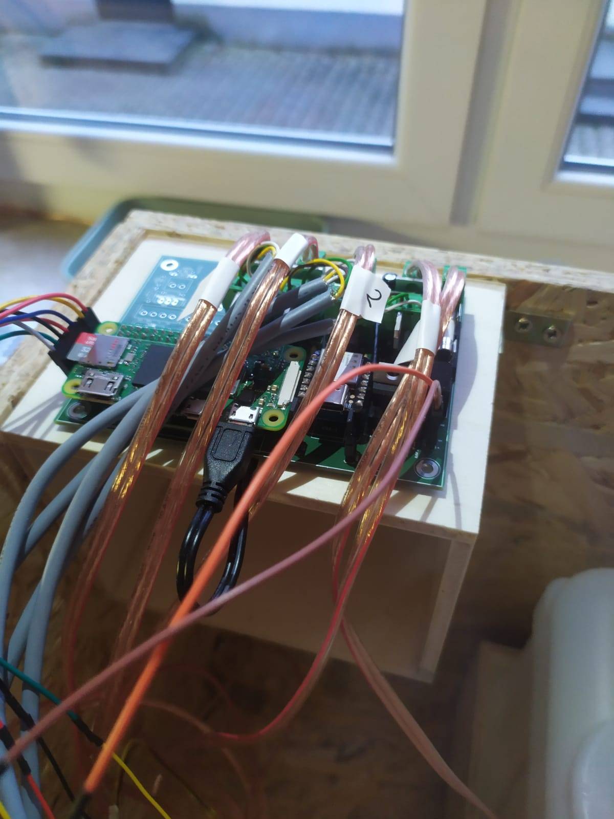 Die Bodenfeuchte der Blumentöpfe am Regal wird mit Hilfe von Bodenfeuchtesensoren erfasst, die an einen Seeeduino angeschlossen sind. Diesem wird in regelmäßigen, einstellbaren Zeitabständen von einem Raspberry Pi signalisiert, die Messwerte zu erfassen und an den Raspberry Pi zurück zu schicken.