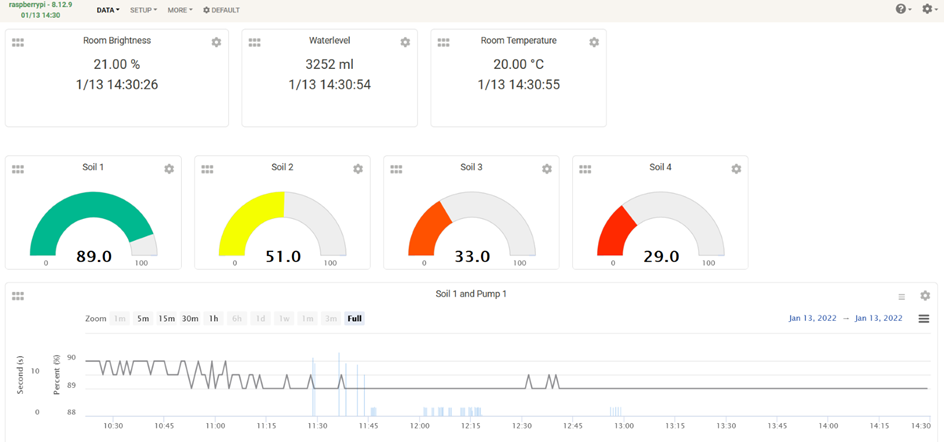 Zusätzlich werden Temperatur und Luftfeuchtigkeit gemessen und wie die Bodenfeuchtigkeit gespeichert und im lokalen Netzwerk für verschiedenste Endgeräte zur Verfügung gestellt. Hierüber werden auch Informationen über den Füllstand des eingebauten Wassertanks zur Verfügung gestellt.