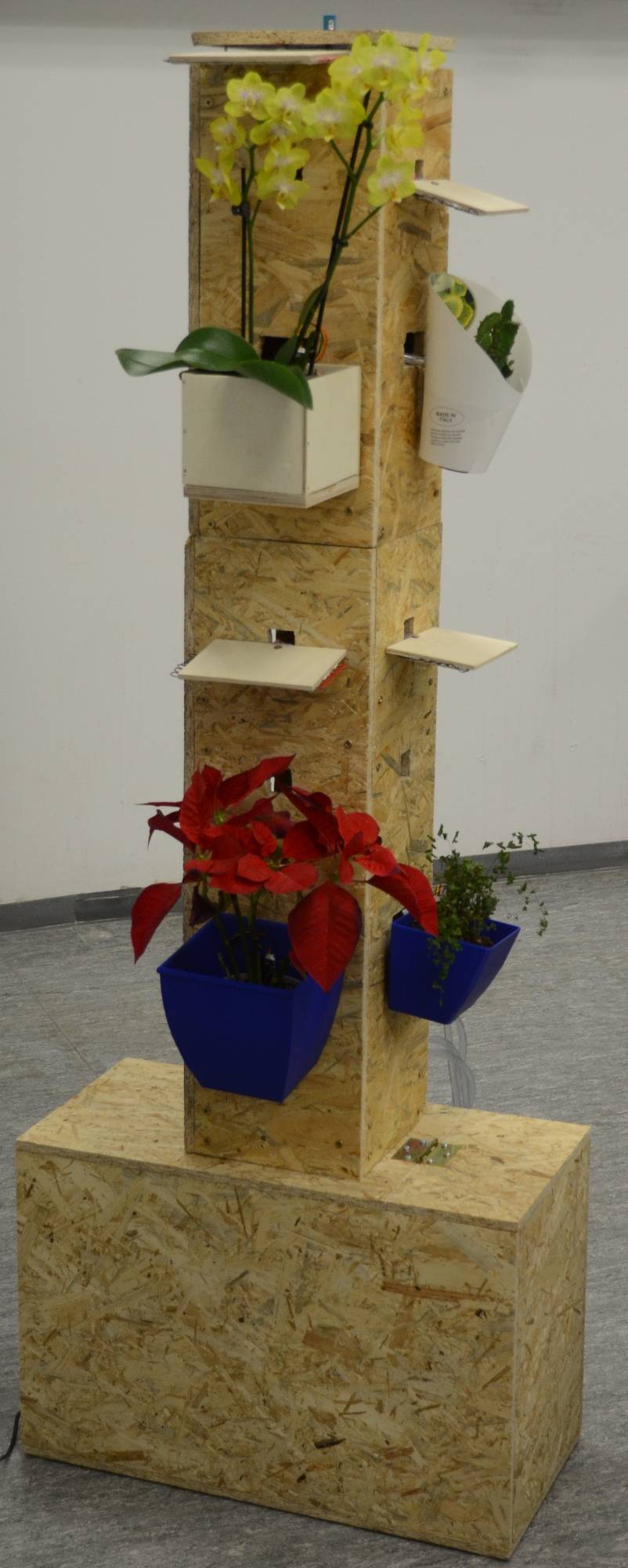 Ziel dieses Projektes war die Entwicklung eines automatisierten Blumenregals für Personen, die sich unregelmäßig um ihre Pflanzen kümmern - weil sie entweder einen Zweitwohnsitz haben oder nicht wissen, wie oft sie gießen müssen. Zudem sollte das System um Zusatzfunktionen wie z.B. die Messung von Helligkeit oder Luftfeuchte im Raum erweitert werden können, welche auf einer Webseite dargestellt werden.