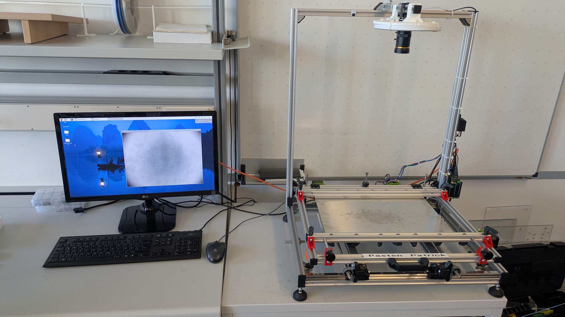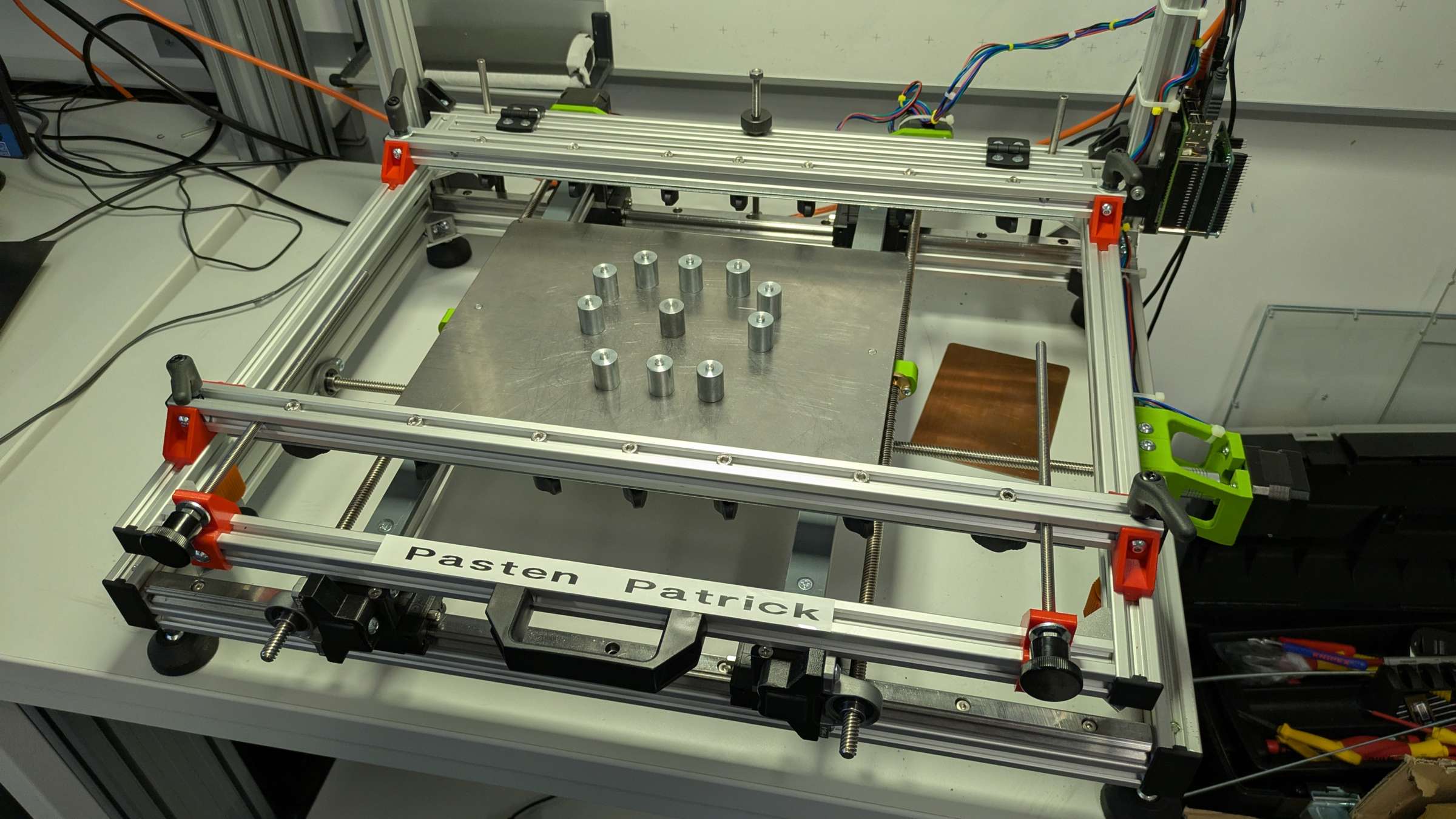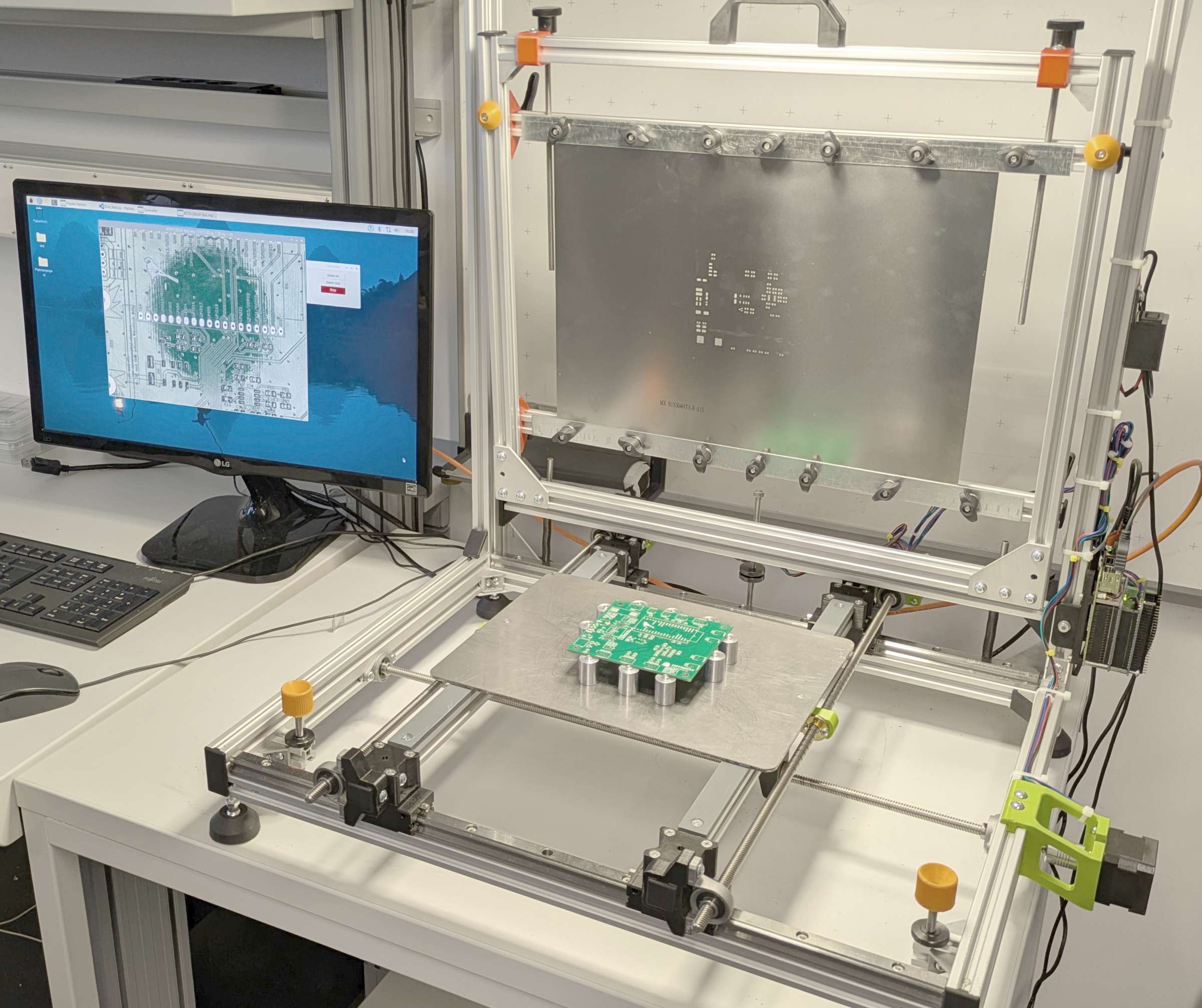 In diesem Gerät kann die Schablone und die Platine fest eingespannt und zueinander ausgerichtet werden, sodass die Lötpaste einfach aufzubringen ist. Außerdem ist eine Kamera über der Vorrichtung angebracht, wodurch die Position der Platine und Schablone zueinander erkannt werden kann und automatisch über Motoren ausgerichtet werden kann.