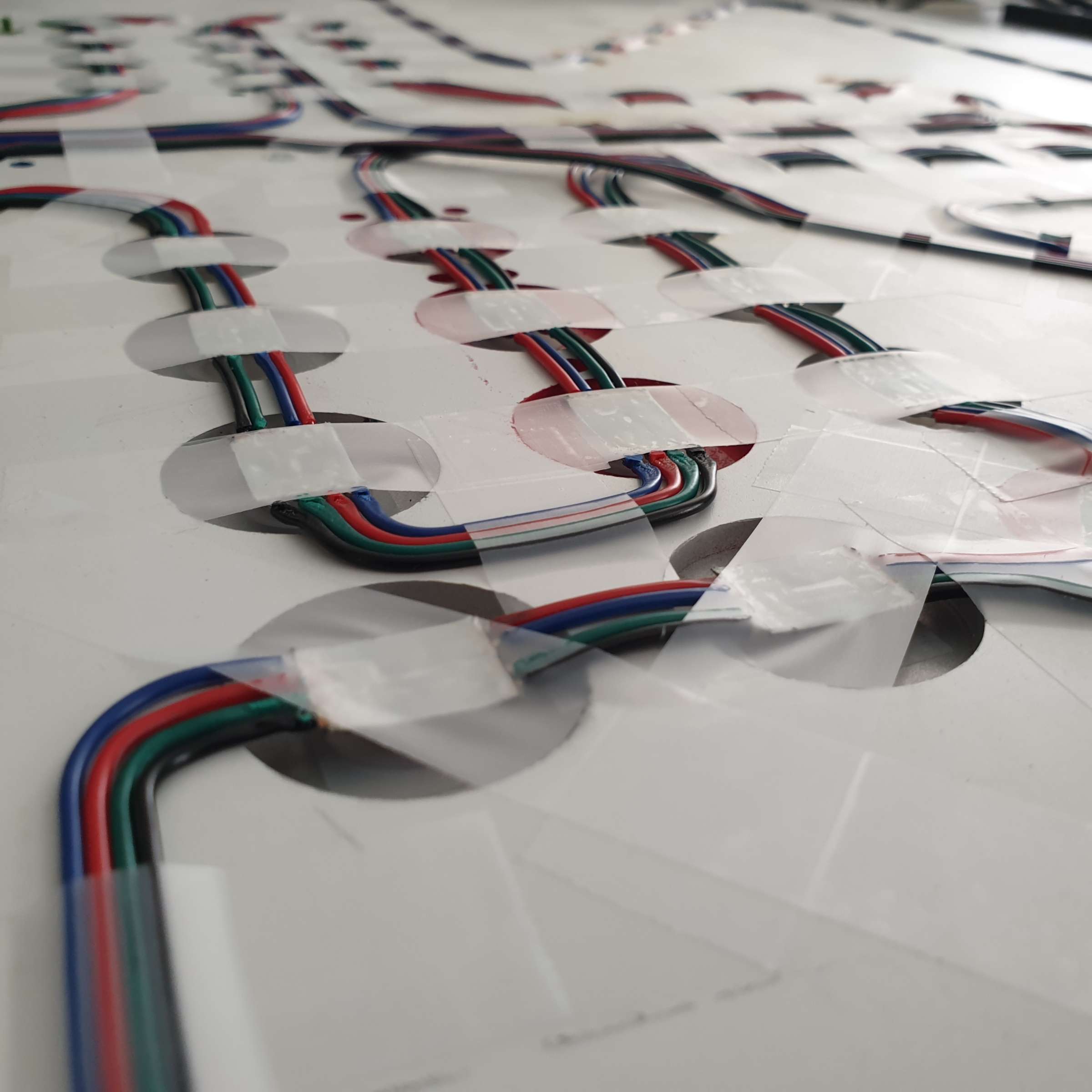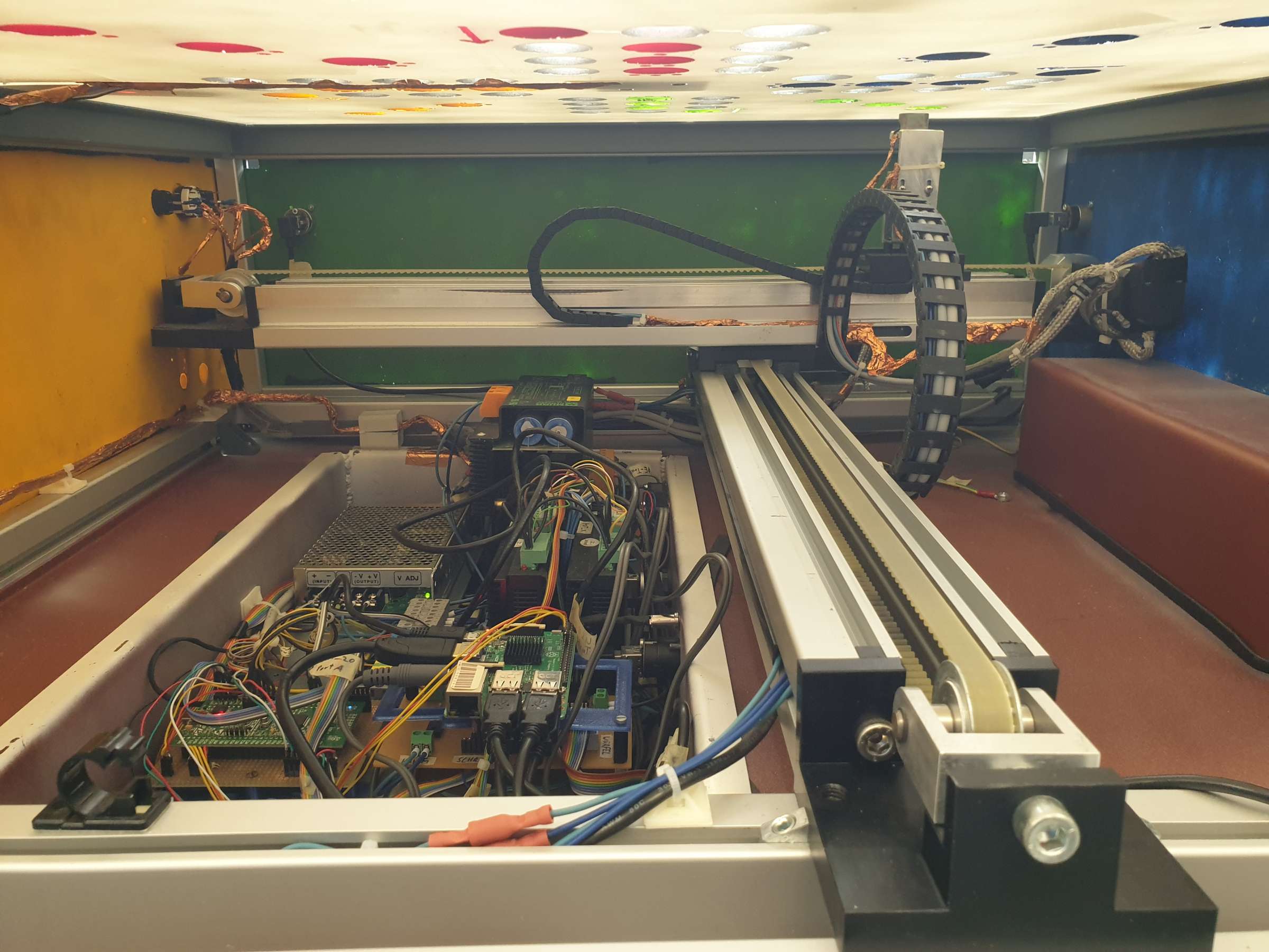 Auf seiner Oberseite befindet sich ein großes Meschen-Aergere-Dich-Nicht Spielfeld, unter dem eine 2-Achsen-Kinematik von Schrittmotoren angetrieben wird.