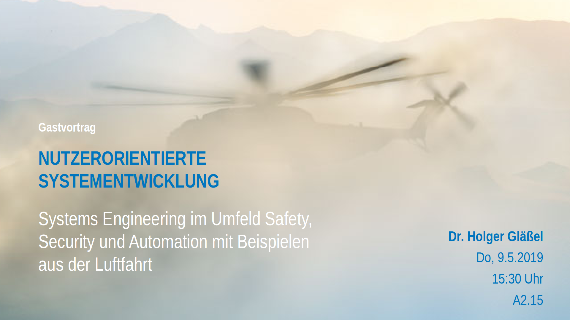Herr Dr. Holger Gläßel wird in einem Gastvortrag vorstellen, wie ein nutzerzentrierter Systementwicklungsprozess in der Praxis angewendet werden kann. Dabei wird er auf Erfordernisse hinsichtlich Safety, Security und Automation eingehen, welche im Bereich der Luftfahrt von besonderer Wichtigkeit sind und dies anhand von Beispielen verdeutlichen.