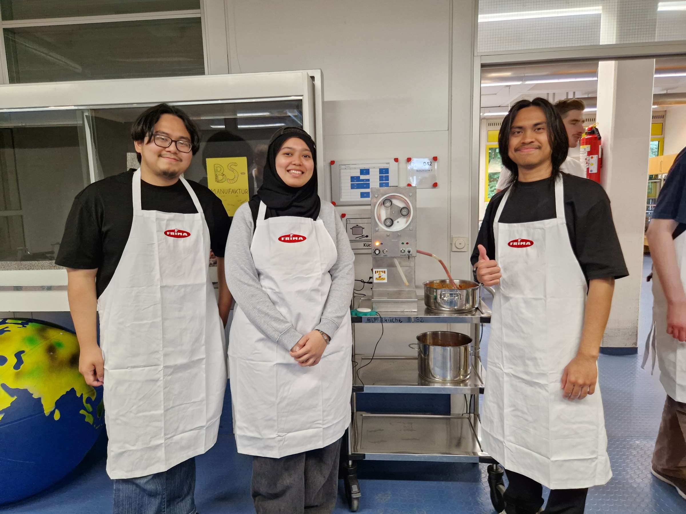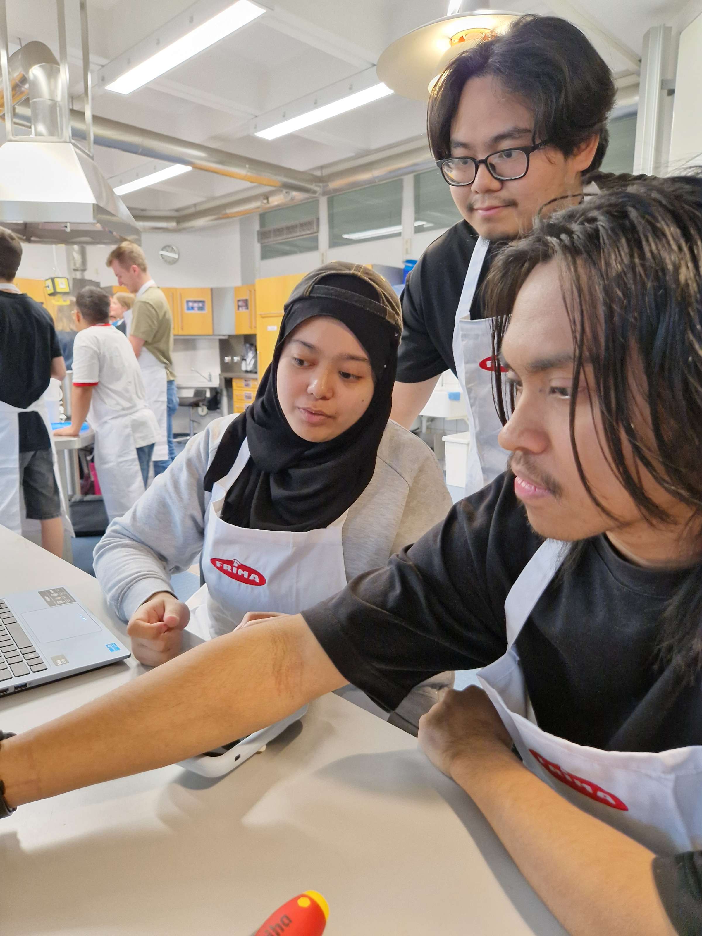 Für Staunen sorgte der von Studierenden aus Malaysia entwickelte Soßenportionierer mit integrierter Waage: Eine Pumpe transportiert auch stückige Soßen grammgenau auf Teller oder in Einmachgläser. Auch diese Lösung wurde am Vormittag noch angepasst. Der Motor drehte zunächst nicht kräftig genug. Doch pünktlich zum „Essen fassen“ tat sie ihren Dienst.