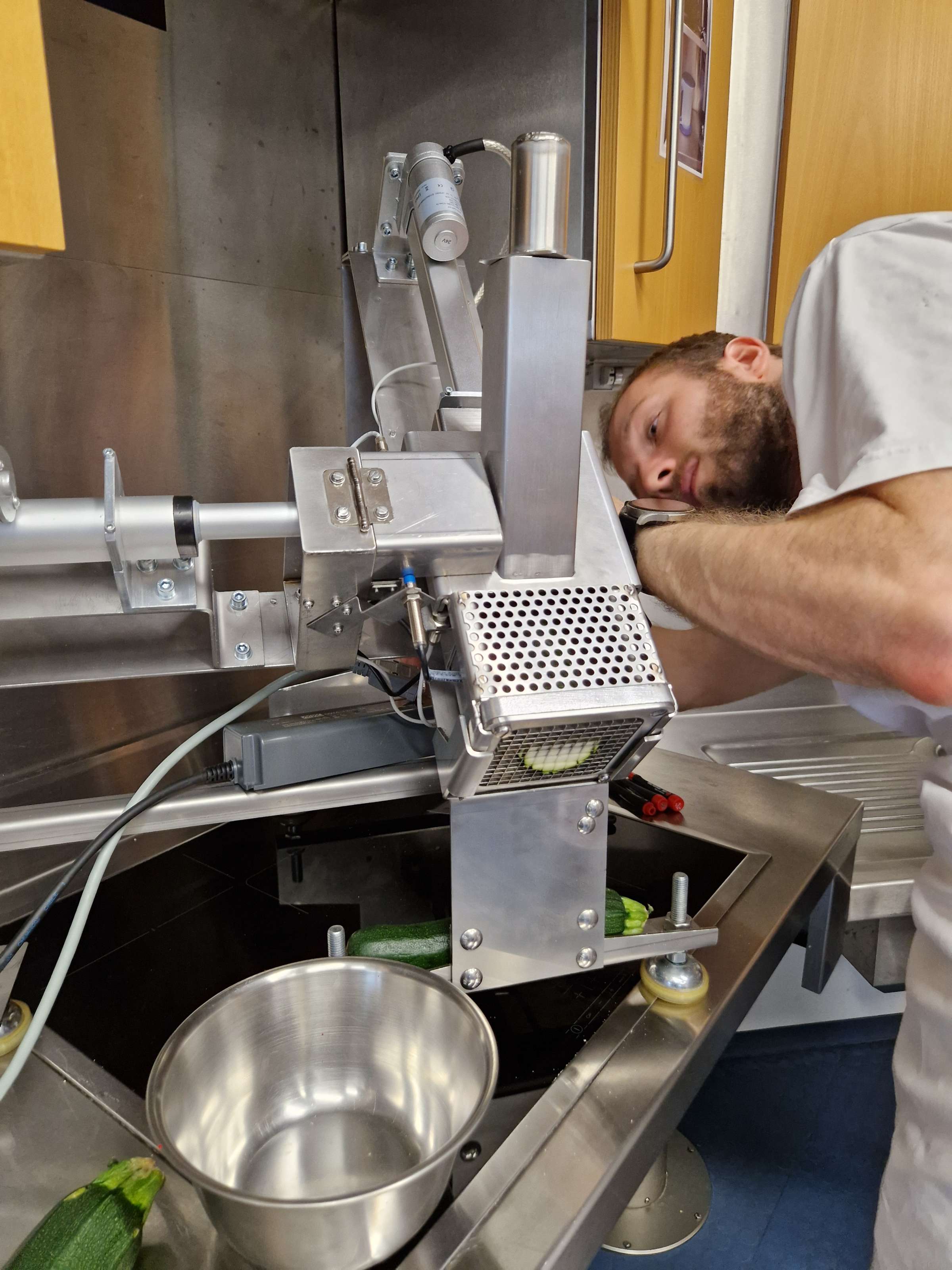 Die Kraft, um eine Karotte oder Zucchini für die Soße in gleichgroße Streifen zu schneiden, fehlt vielen Kindern im Fritz-Felsenstein-Haus. Deshalb erledigt das ein vollautomatischer Gemüseschneider. Er presst mit 30 Kilogramm Schubkraft das Gemüse durch ein Hobelsystem. Die Konstruktion wurde vor Ort noch optimiert – ein bewusster Teil des Lernprozesses: „Wir dürfen hier Fehler machen,” sagt Mechatronik-Student Quentin. „Im Berufsleben passiert’s nicht mehr.“