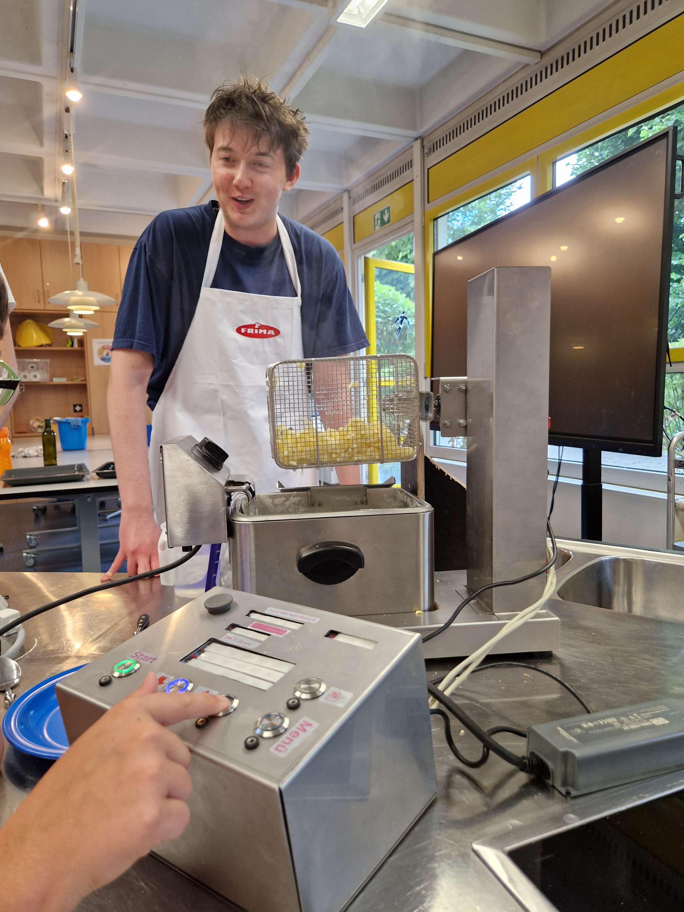 Nicht nur Soße schmeckt frisch und selbstgemacht am besten. Auch Pasta. Deshalb haben die Studierenden hier gleich zwei Lösungen erarbeitet: Eine motorisierte Walze, die Teig in gleichmäßige Bahnen presst, sowie ein zweites System zur direkten Formgebung – etwa für Maccheroni. Diese werden von den Schülerinnen und Schüler mit einem Schaber abgenommen und anschließend in einer umgebauten Fritteuse gegart. Statt heißem Fett enthält diese Wasser. Der Korb senkt und hebt sich automatisch und wird von den Kindern per Taster gesteuert.