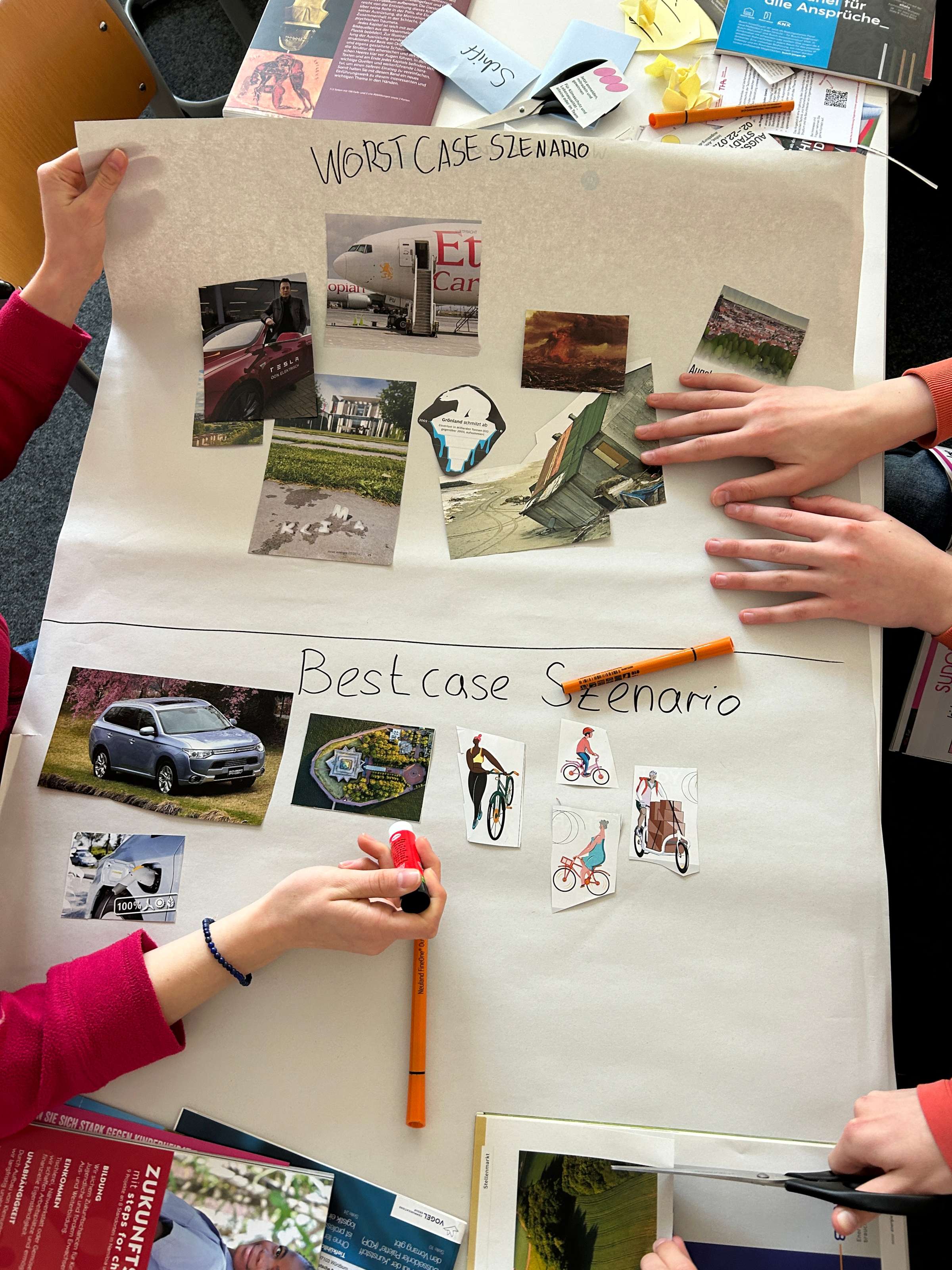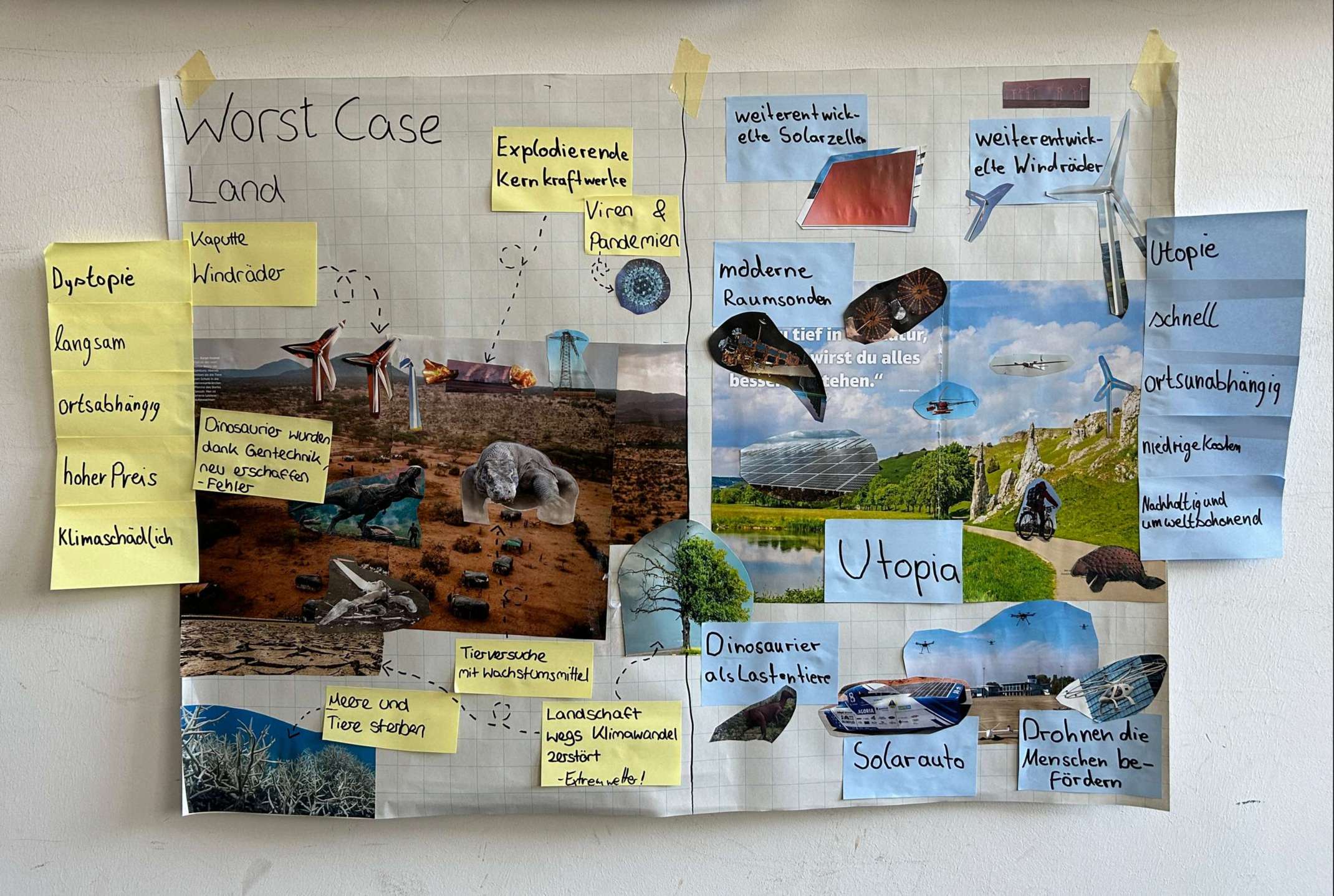 Als Beispiel wurde die Frage bearbeitet, wie die Mobilität in Zukunft aussehen wird und welche technischen Ideen dafür gebraucht werden. Dieser Fragestellung durften sich die Schülerinnen und Schüler spielerisch im Rahmen einer Übung zur Szenariotechnik widmen und Utopien sowie Dystopien für die Mobilität in Stadt- und Landleben entwickeln. Die dabei entstandenen Collagen wurden präsentiert und diskutiert. Sie bildeten anschließend die Grundlage für innovative Produktideen, welche die Übungsgruppen mit gezeichneten Skizzen in die Zukunft projizierten.