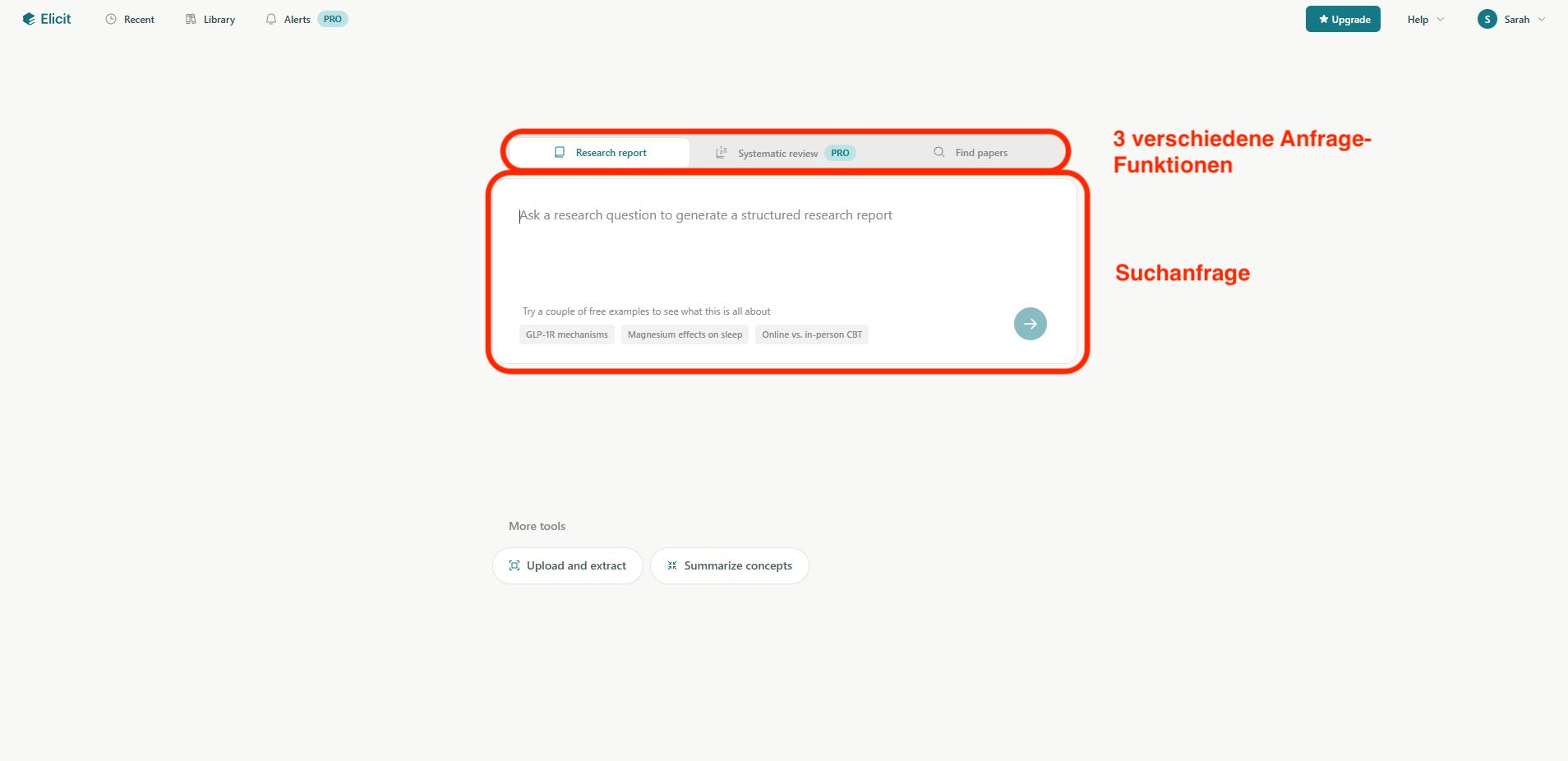 Elicit ist ein KI-gestütztes Literaturrecherche-Tool, das schnell und effizient dabei unterstützt, wissenschaftliche Artikel zu finden und zu analysieren. Anstatt nach Stichwörtern zu suchen, wird die Recherche bei Elicit mit einer Forschungsfrage begonnen. Die Frage wird von einem GPT-Sprachmodell genutzt, um darauf bezogene relevante Beiträge aus der Semantic Scholar-Datenbank mit über 125 Mio. Publikationen zu filtern.