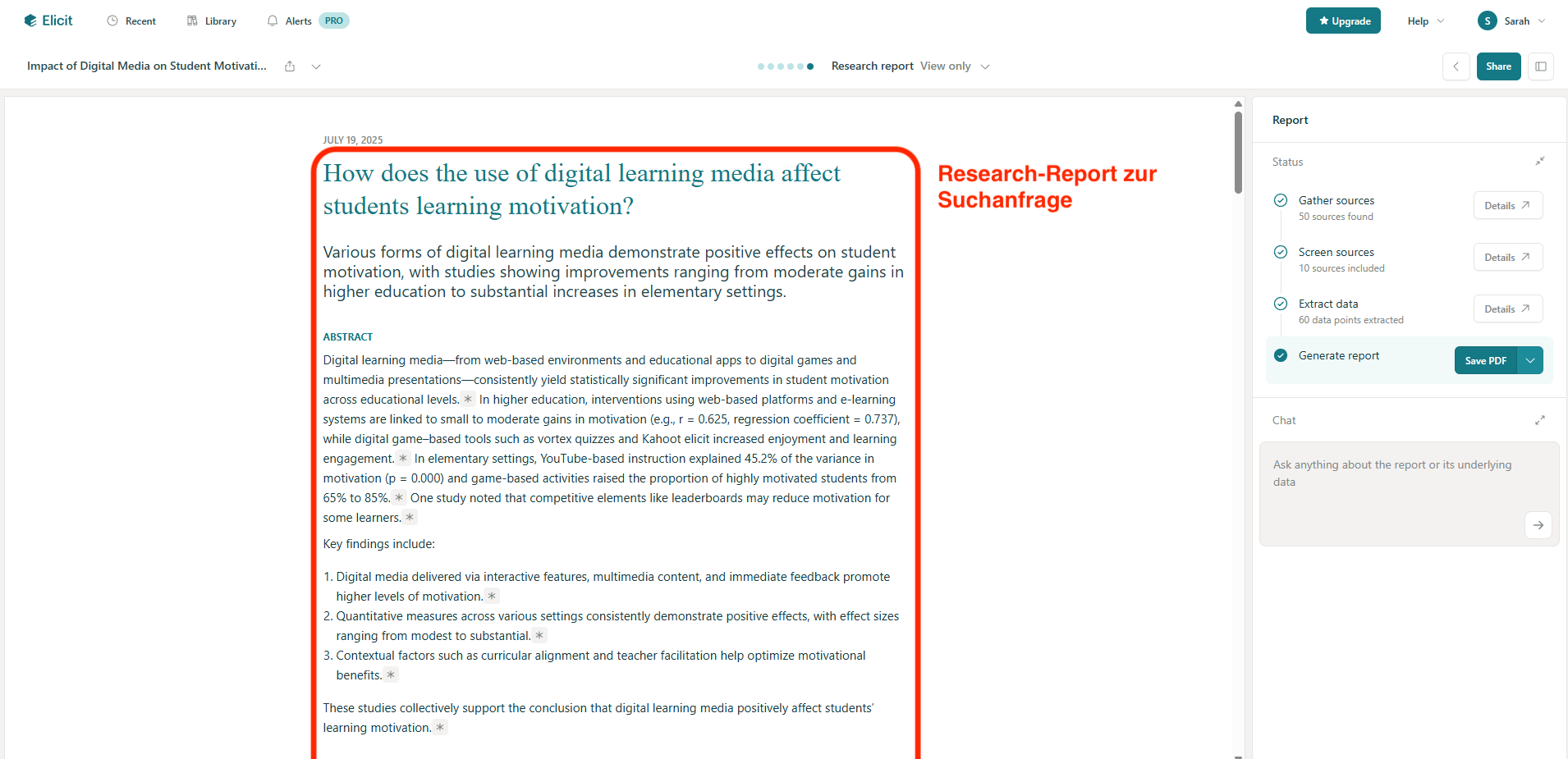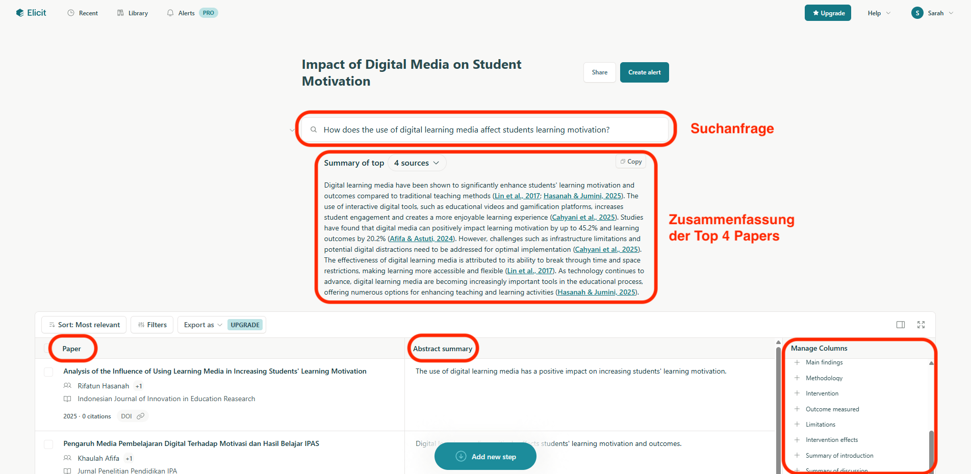 - Elicit kann Studierenden helfen, neue Forschungshypothesen zu entwickeln, indem es aufzeigt, welche Fragen in der aktuellen Literatur noch nicht beantwortet sind. Die identifizierten Forschungslücken können gemeinsam mit der Lehrkraft im Unterricht diskutiert werden.