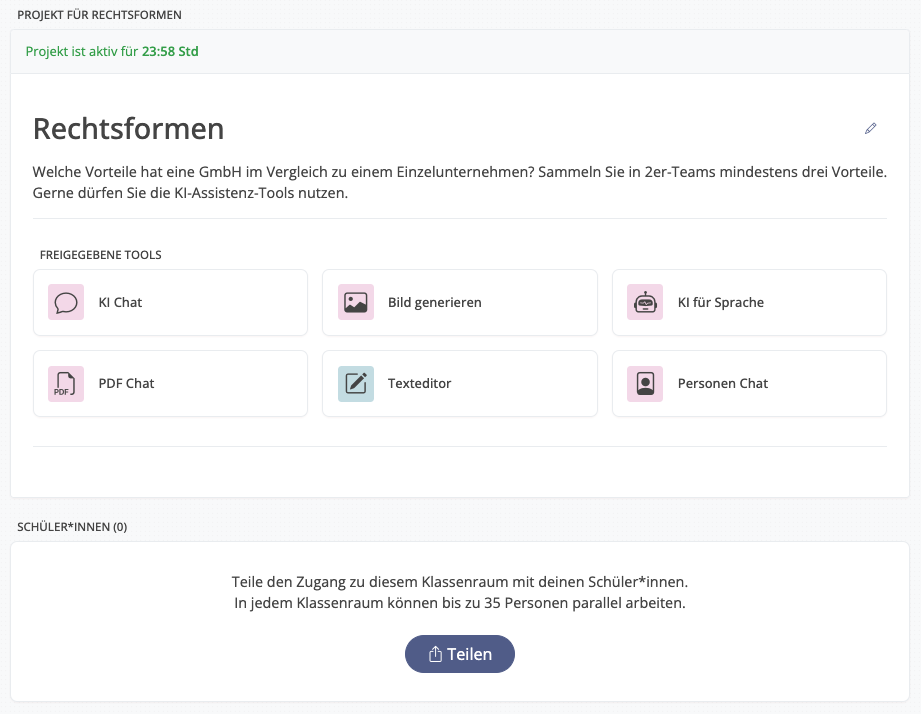 Jede:r Student:in erhält einen eigenen Zugang zu den KI-Tools. Die Studierenden müssen sich nicht bei Open AI registrieren. Nach 24 Stunden werden der Klassenraum und die eingegebenen Inhalte gelöscht.
