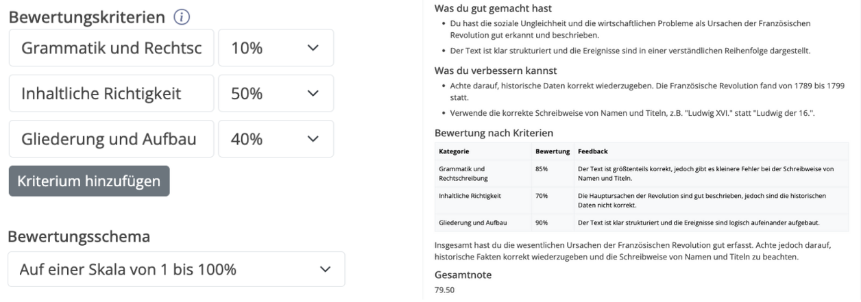 Die KI-Assistenz für Korrekturen ermöglicht eine effiziente Textbewertung, wodurch der Korrekturaufwand erheblich reduziert werden kann: Es besteht die Möglichkeit, eigene Bewertungskriterien festzulegen, individuelles Feedback, Verbesserungsvorschläge sowie automatische Fehlerlisten zu erhalten.