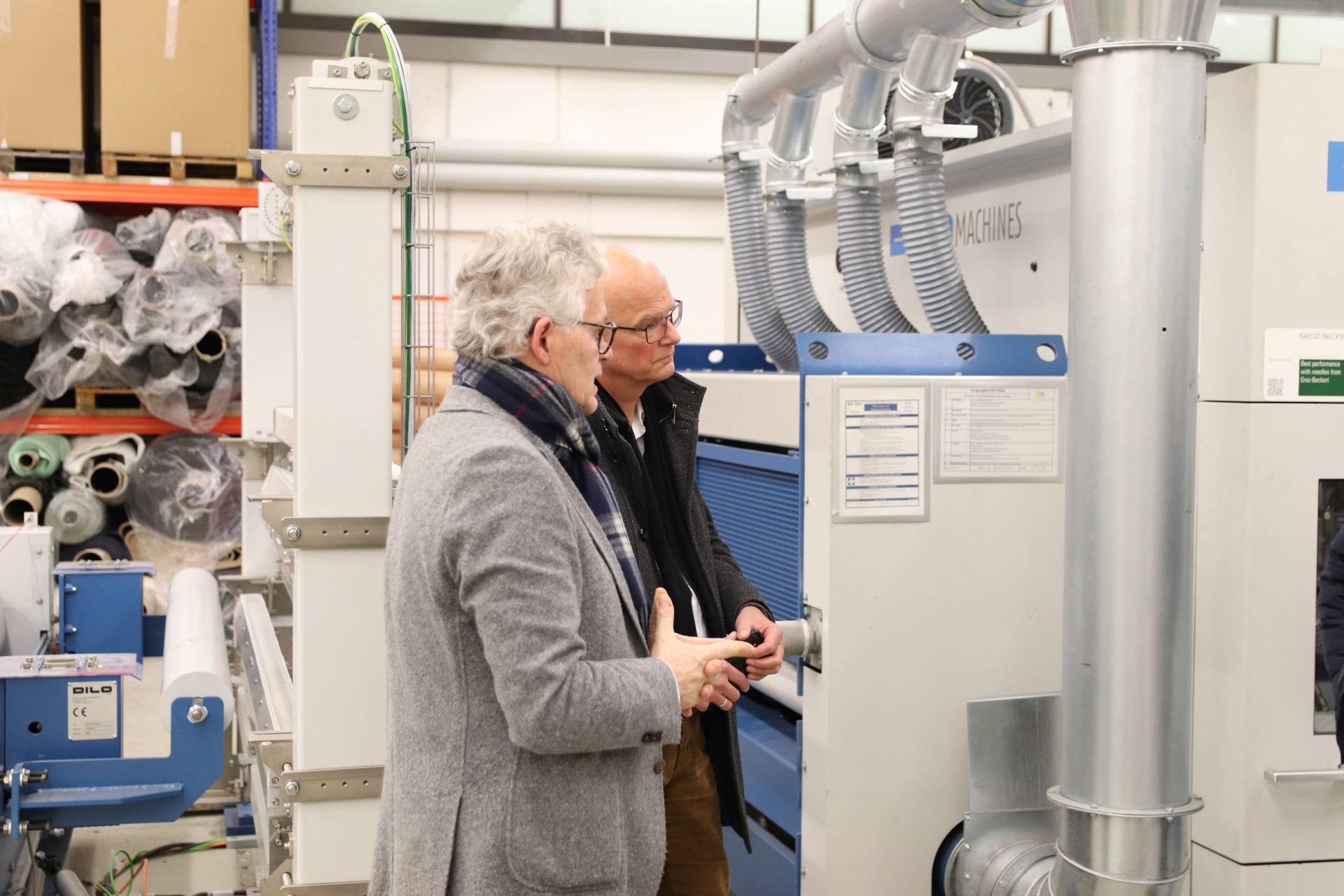 Schlichter führte die Gäste durch die einzelnen Stationen des Prozesses im Recycling Atelier. Wichtig ist ihm hierbei, dass die Forschungserkenntnisse hier schon aktiv von Unternehmen genutzt werden. Zum Beispiel, um die Zusammensetzung von zu recycelnden Textilien mittels KI zu analysieren und mögliche Wiederverwendungen in neuen, hochwertigen Produkten (Fachbegriff: Upcycling) zu erkennen.