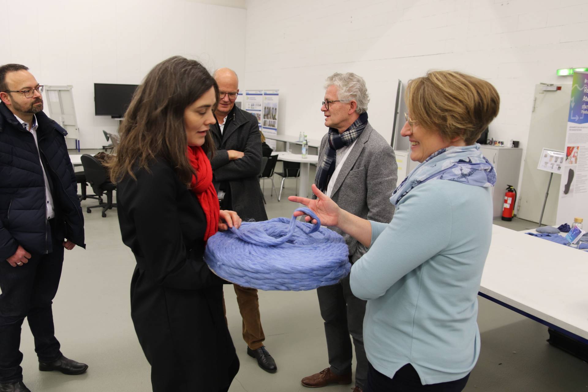 Mit auf dem Plan stand auch ein Besuch des Recycling Ateliers der Hochschule Augsburg. Hier führten Prof. Dr. Stefan Schlichter, Leiter des An-Instituts für Textiltechnik Augsburg (ITA) und Kopf und Herz des Recycling Ateliers, sowie Prof. Dr. Nadine Warkotsch, Vizepräsidentin für Forschung und Nachhaltigkeit, und Prof. Dr. Björn Häckel, wissenschaftlicher Leiter des KI-Produktionsnetzwerks an der Hochschule Augsburg, die Gäste durch ihre nachhaltige Forschungs- und Entwicklungsarbeit im Recycling Atelier.