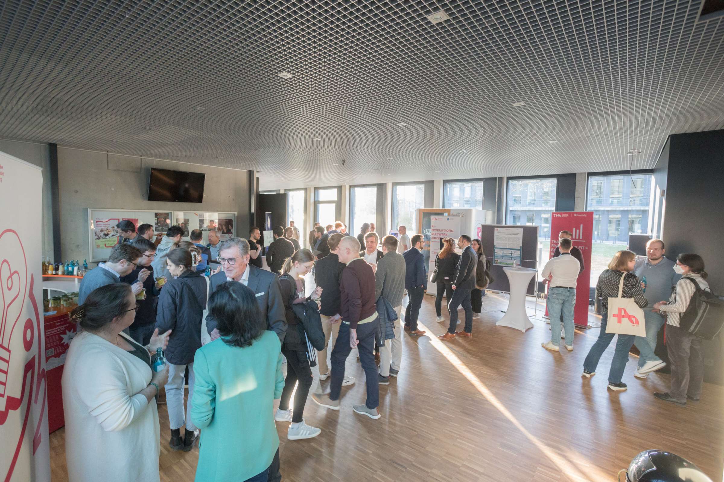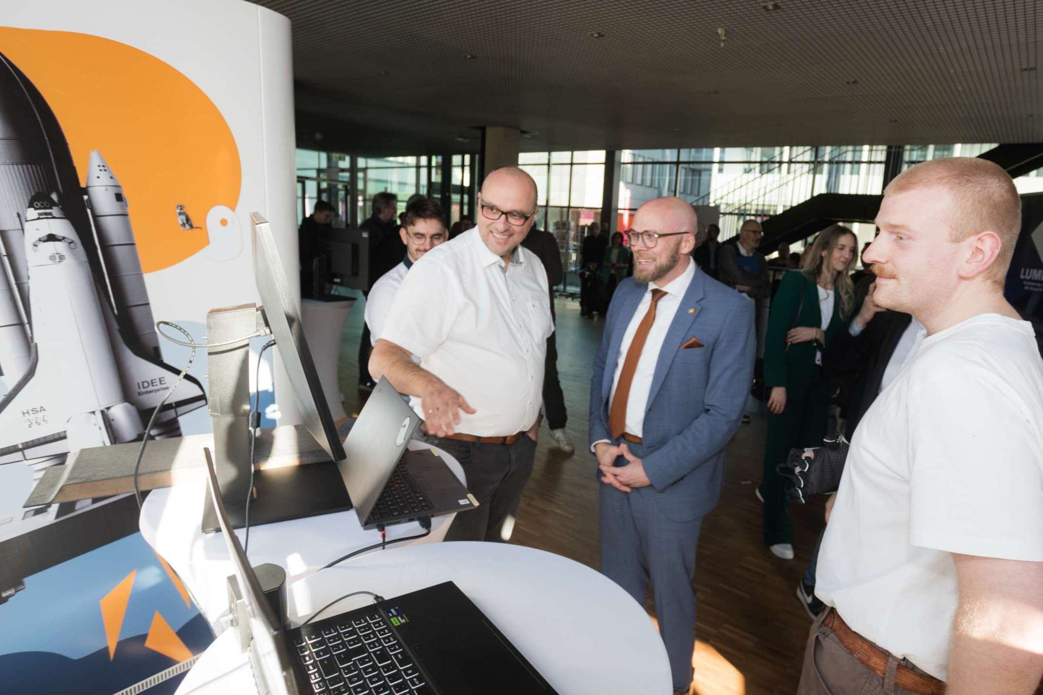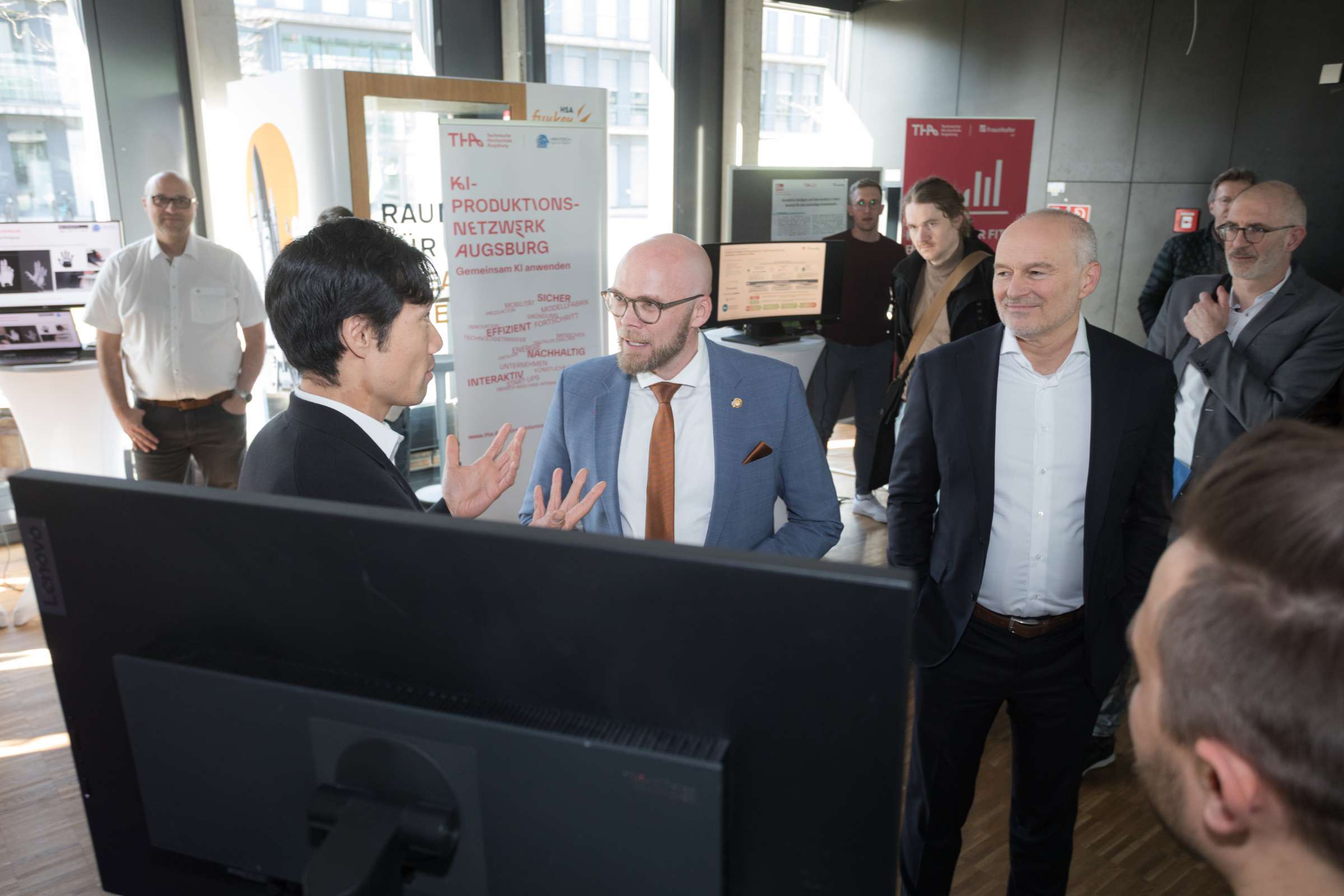 Im Foyer informierte sich der Bayerische Digitalminister über aktuelle Projekte des KI-Produktionsnetzwerks der THA.