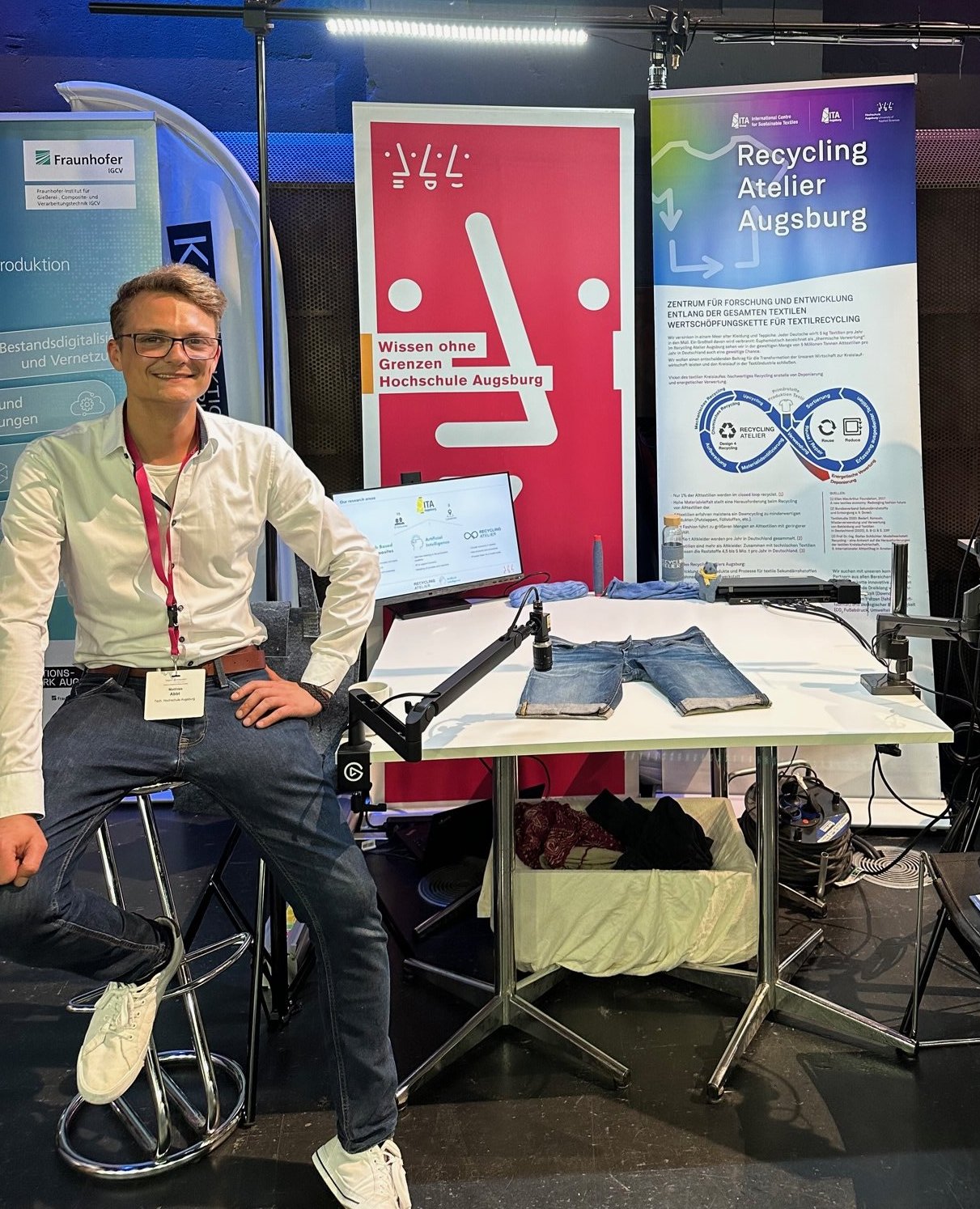 Das Recycling Atelier, das gemeinschaftlich von THA und ITA Augsburg betrieben wird, zeigte eine Anwendung von KI zur Datenverfolgung und Optimierung von Prozessen. Ebenfalls innerhalb des Recycling Ateliers und gemeinsam mit dem HSA_innolab entstand das Projekt detex. Es zeigt einen Ansatz zur automatisierten Erkennung bestimmter Merkmale von Altkleidern. Damit bearbeitet es einen kritischen Teilaspekt für den Sortiervorgang, der heute noch hauptsächlich händisch und anhand der Erfahrung von Mitarbeitenden durchgeführt wird. Zudem wurde zum ersten Mal die neue KI-Vlieslinie vorgestellt.
