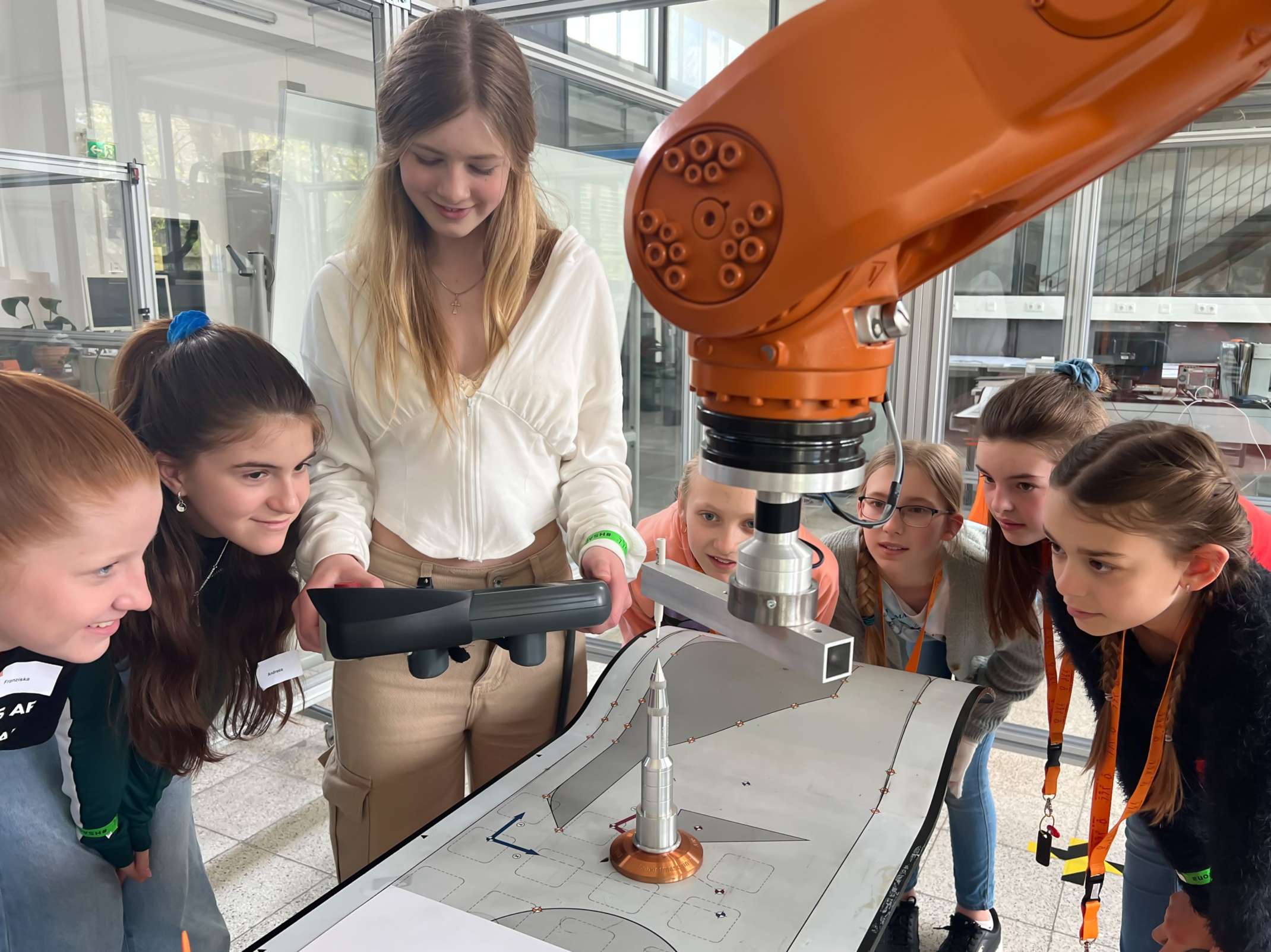 Ganz nach dem Motto „Who runs the machines? Girls!“ wurden auch nebenan in der Fakultät für Maschinenbau und Verfahrenstechnik praktische Erfahrungen für die 12 Girls anschaulich in den Mittelpunkt gerückt. Mit ein wenig Hilfe durften die Schülerinnen einen Industrie-Roboter „kennenlernen“ und die Steuerung letztendlich übernehmen! Dabei spielt die Denkweise hinter derartigen Entwicklungsprozessen natürlich auch eine große Rolle und somit auch im Tag der Girls.