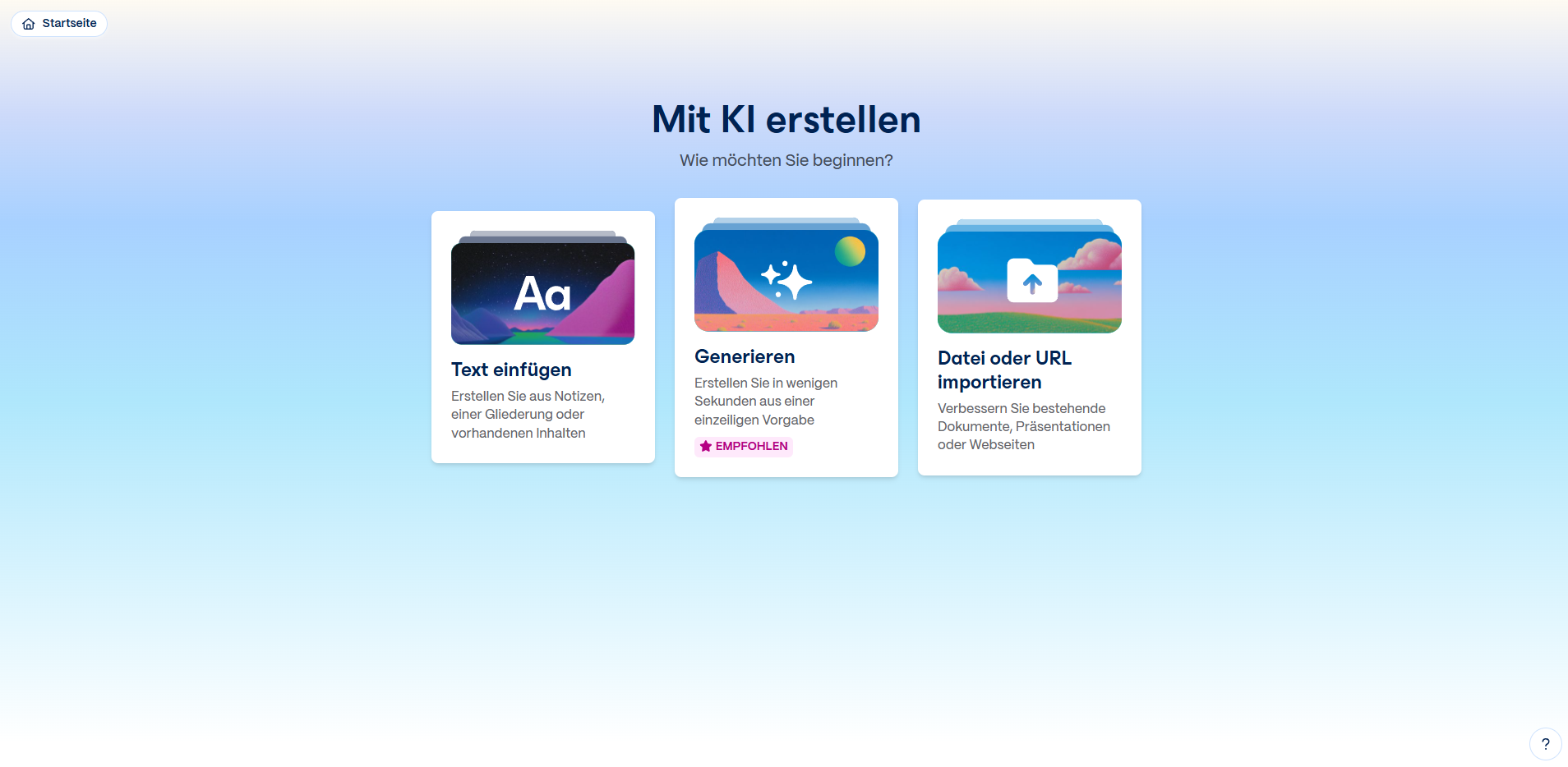 Gamma ist ein KI-Tool für die schnelle Erstellung ansprechender Präsentationen, Dokumente, oder Websites. Nach einem ersten Entwurf kann die Vorlage nachträglich verfeinert und angepasst werden. Die Plattform unterstützt, Informationen klar und verständlich darzustellen und visuell ansprechende Lehr-Lern-Materialien zu erstellen.